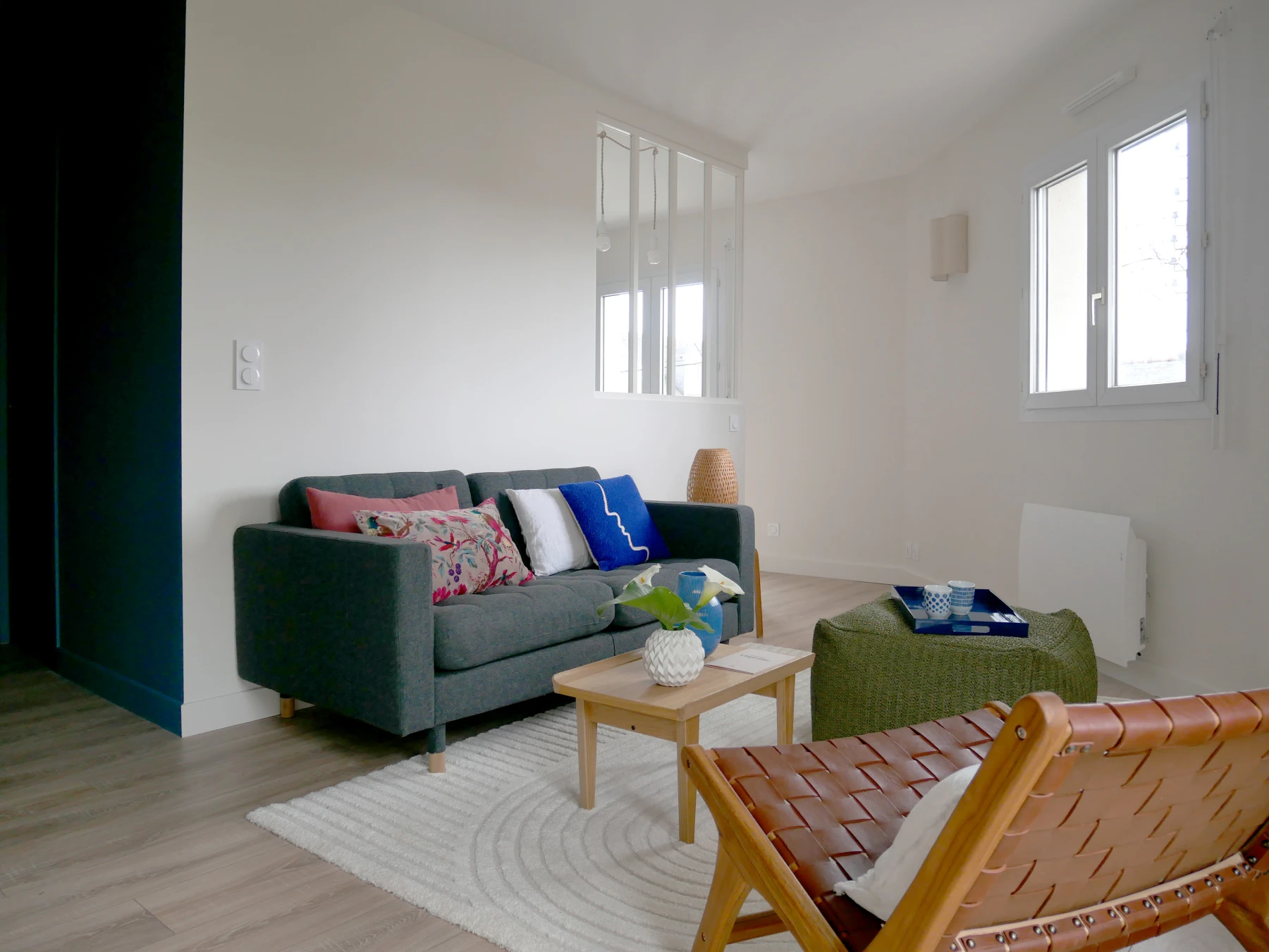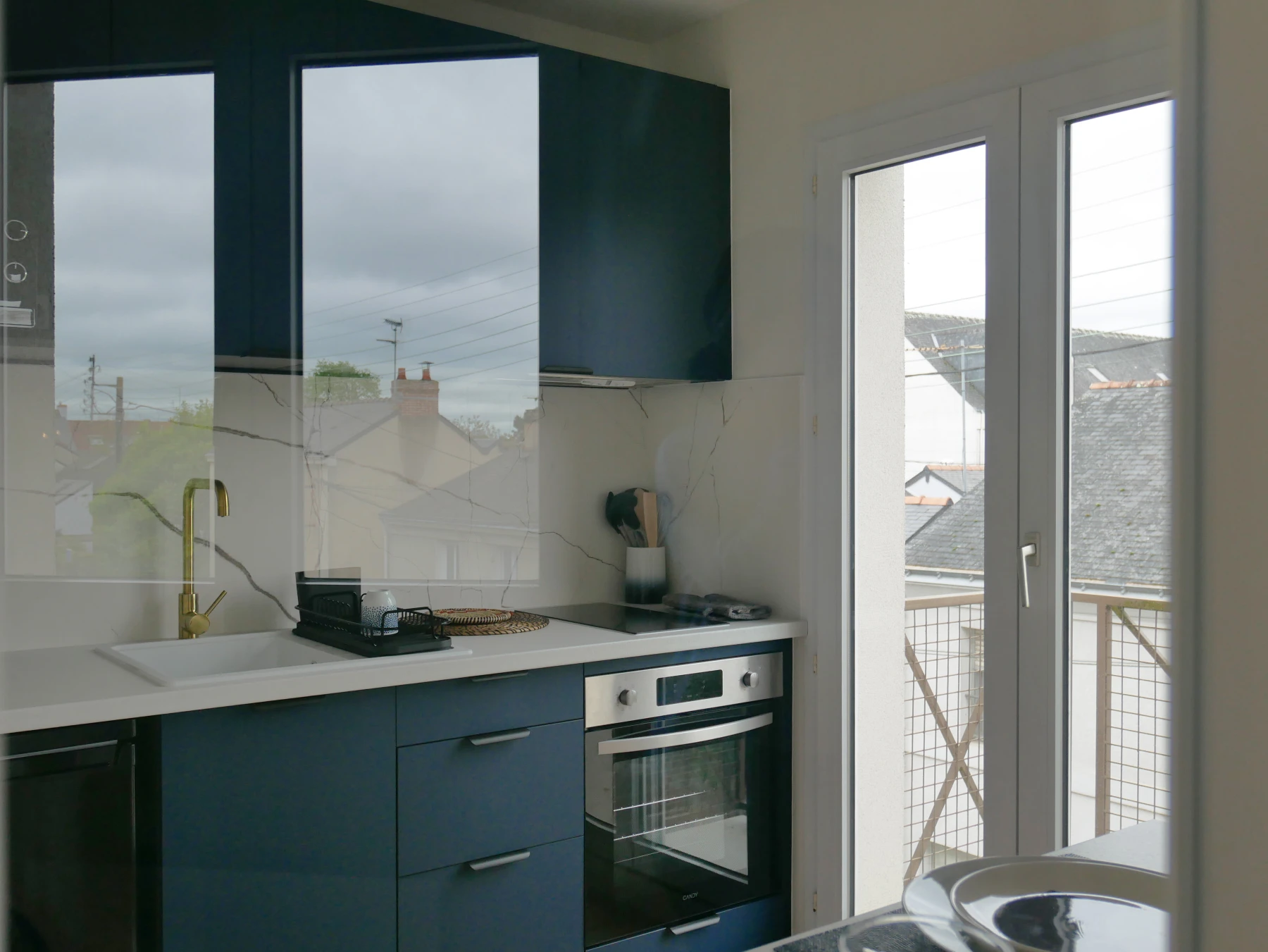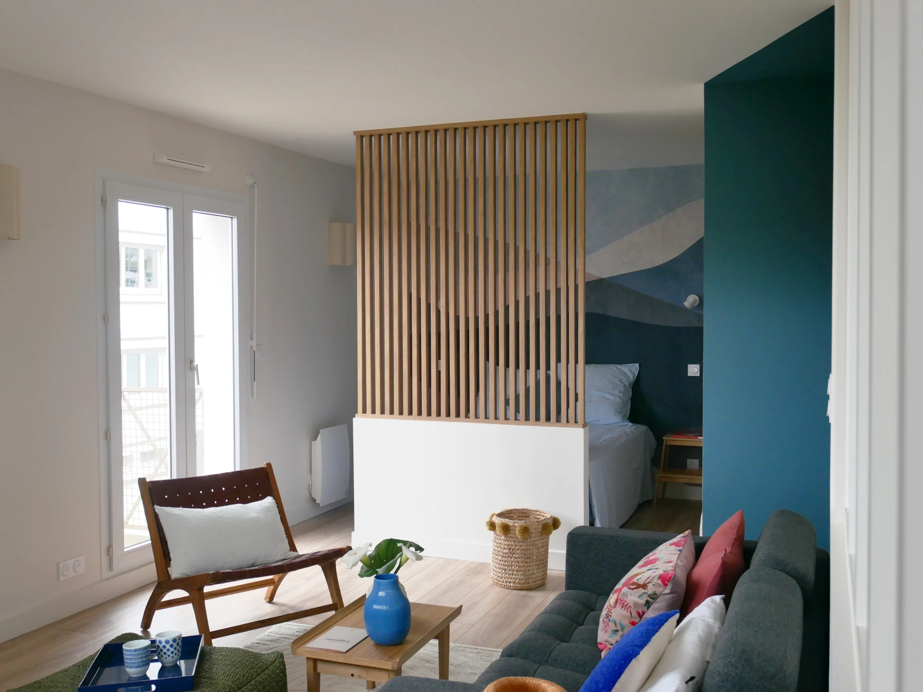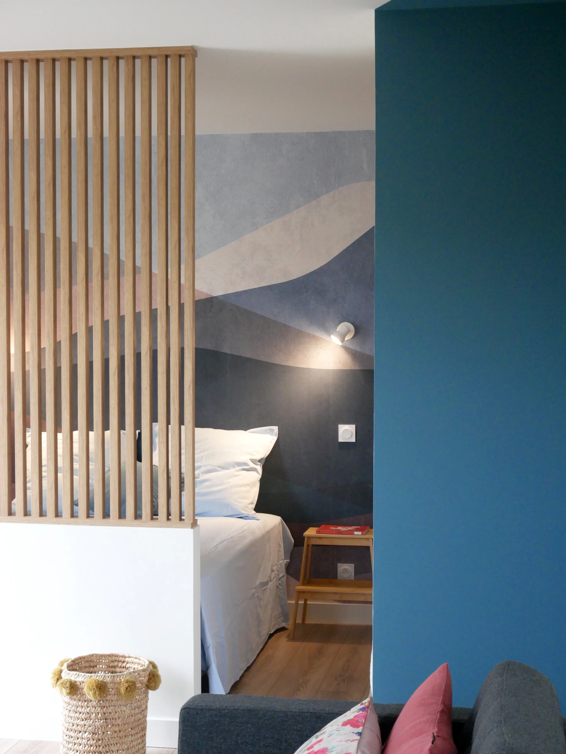 Les volumes ont été complètement redéfinis pour ce studio nantais. Le positionnement des cloisons a été modifié pour permettre de séparer intelligemment les espaces de l'entrée, du salon, du coin nuit, de la cuisine, de la salle de bain, tout en optimisant les solutions de rangement. La teinte bleue est un fil conducteur dans le développement de ce projet, ainsi que les lignes graphiques que l'on retrouve aussi bien sur les murs (claustra, papier peint, verrière) que dans la décoration (tapis, vase, coussins).