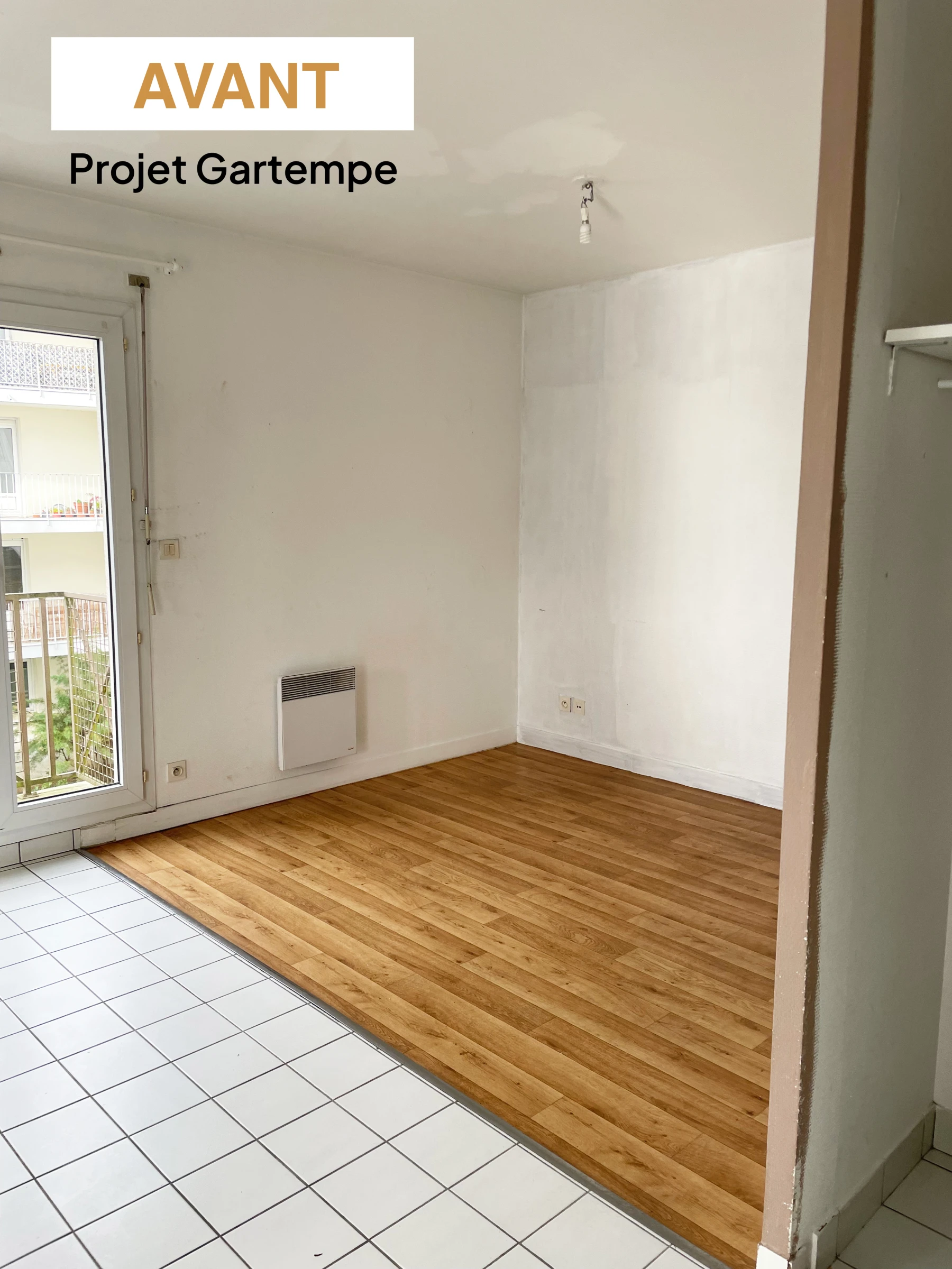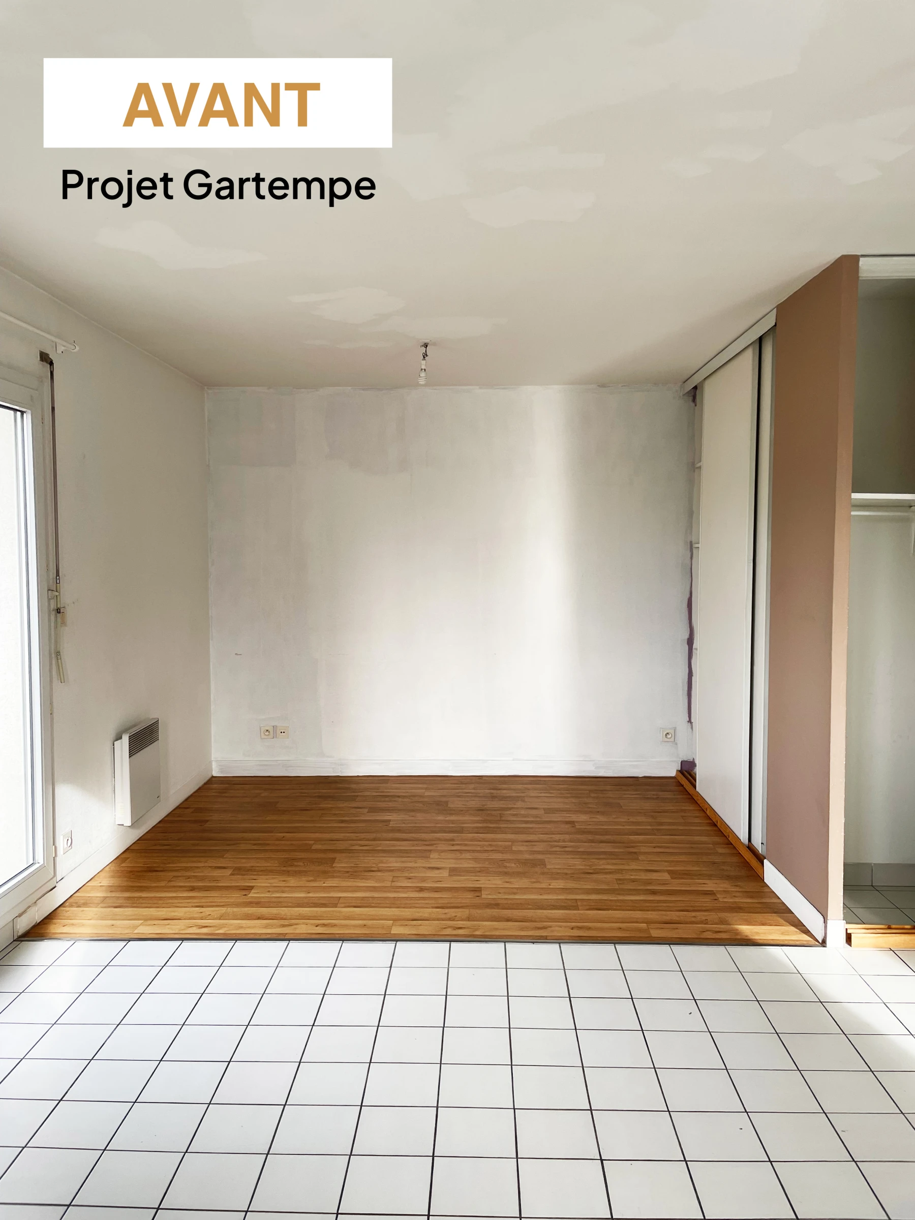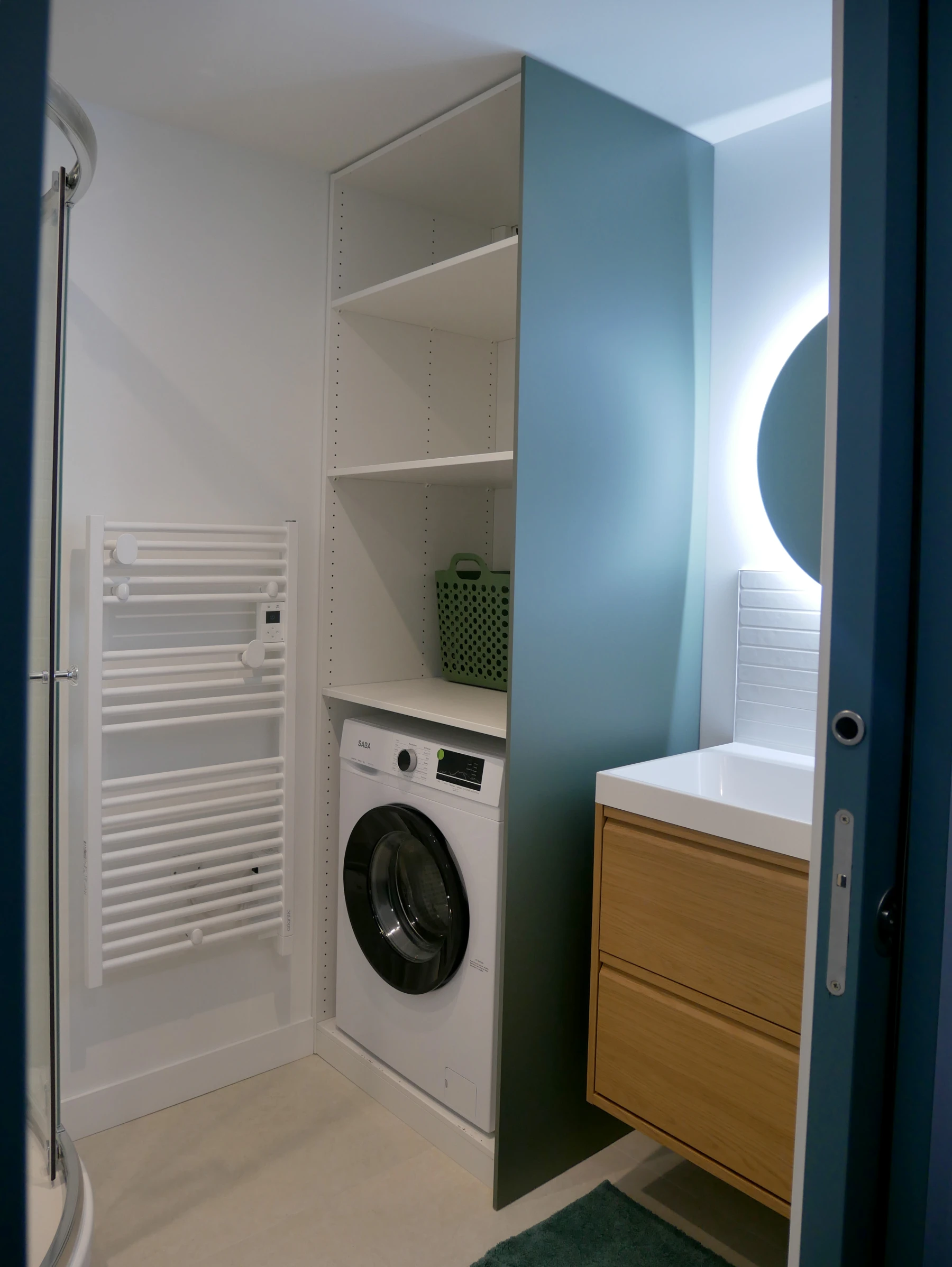 Les volumes ont été complètement redéfinis pour ce studio nantais. Le positionnement des cloisons a été modifié pour permettre de séparer intelligemment les espaces de l'entrée, du salon, du coin nuit, de la cuisine, de la salle de bain, tout en optimisant les solutions de rangement. La teinte bleue est un fil conducteur dans le développement de ce projet, ainsi que les lignes graphiques que l'on retrouve aussi bien sur les murs (claustra, papier peint, verrière) que dans la décoration (tapis, vase, coussins).