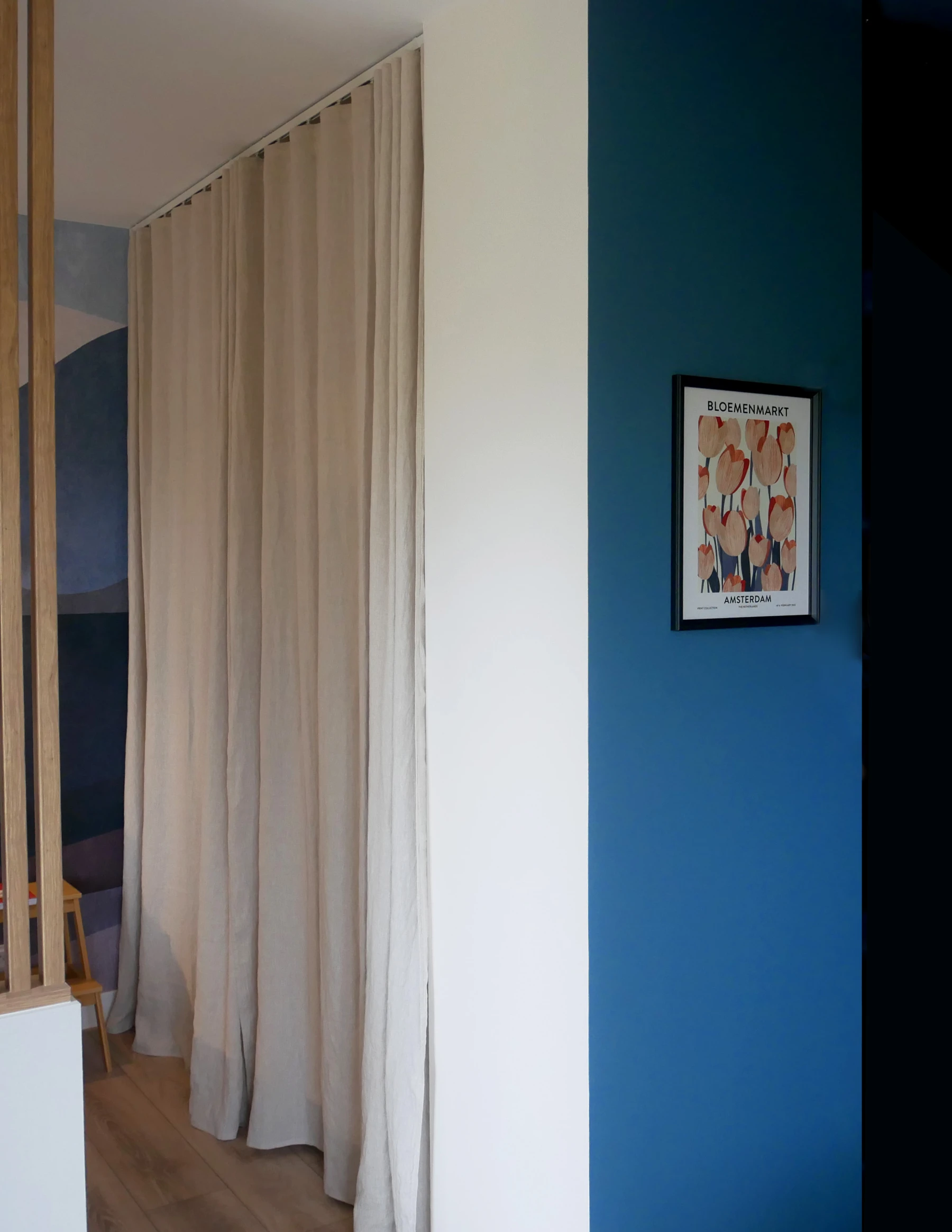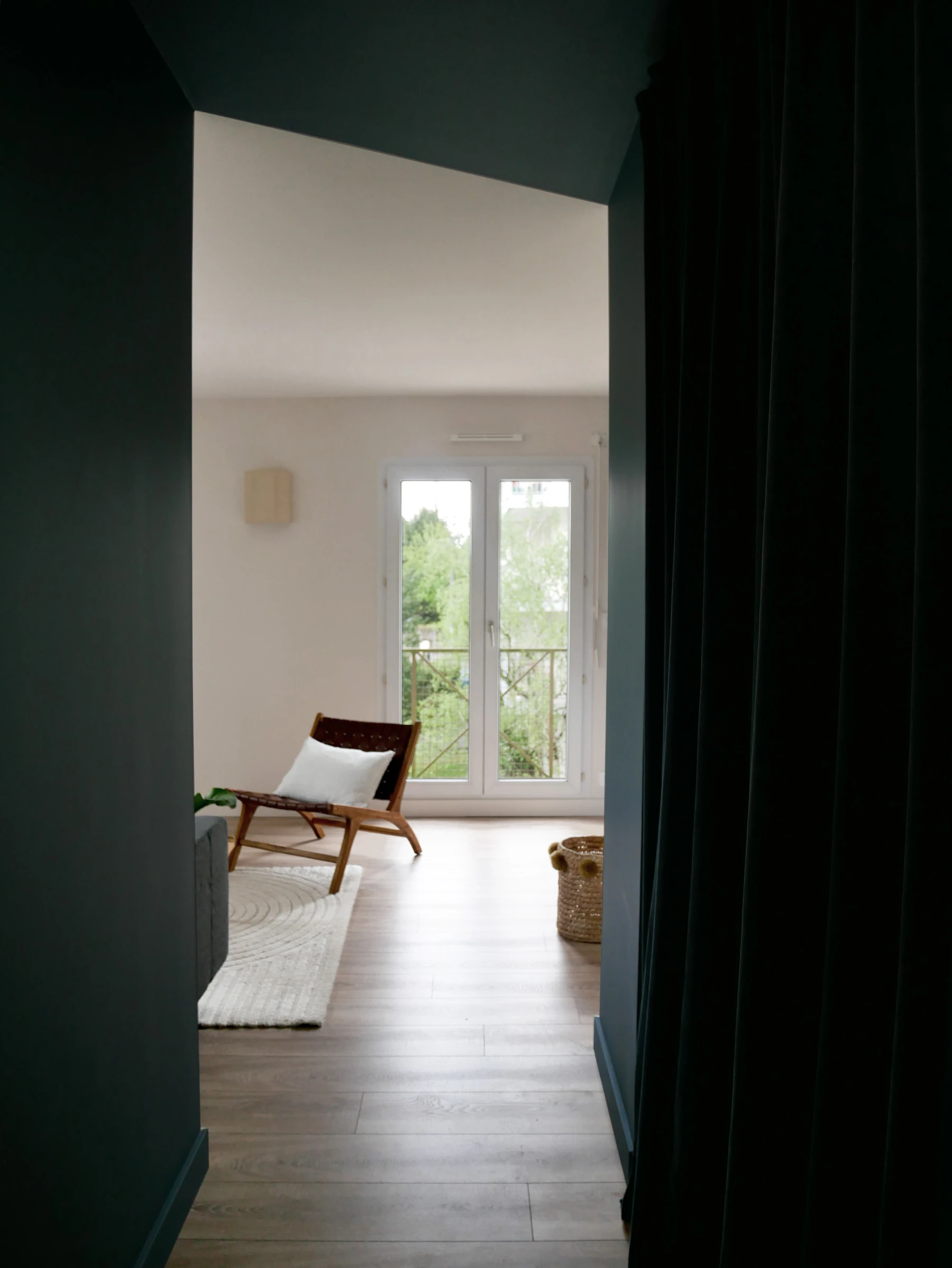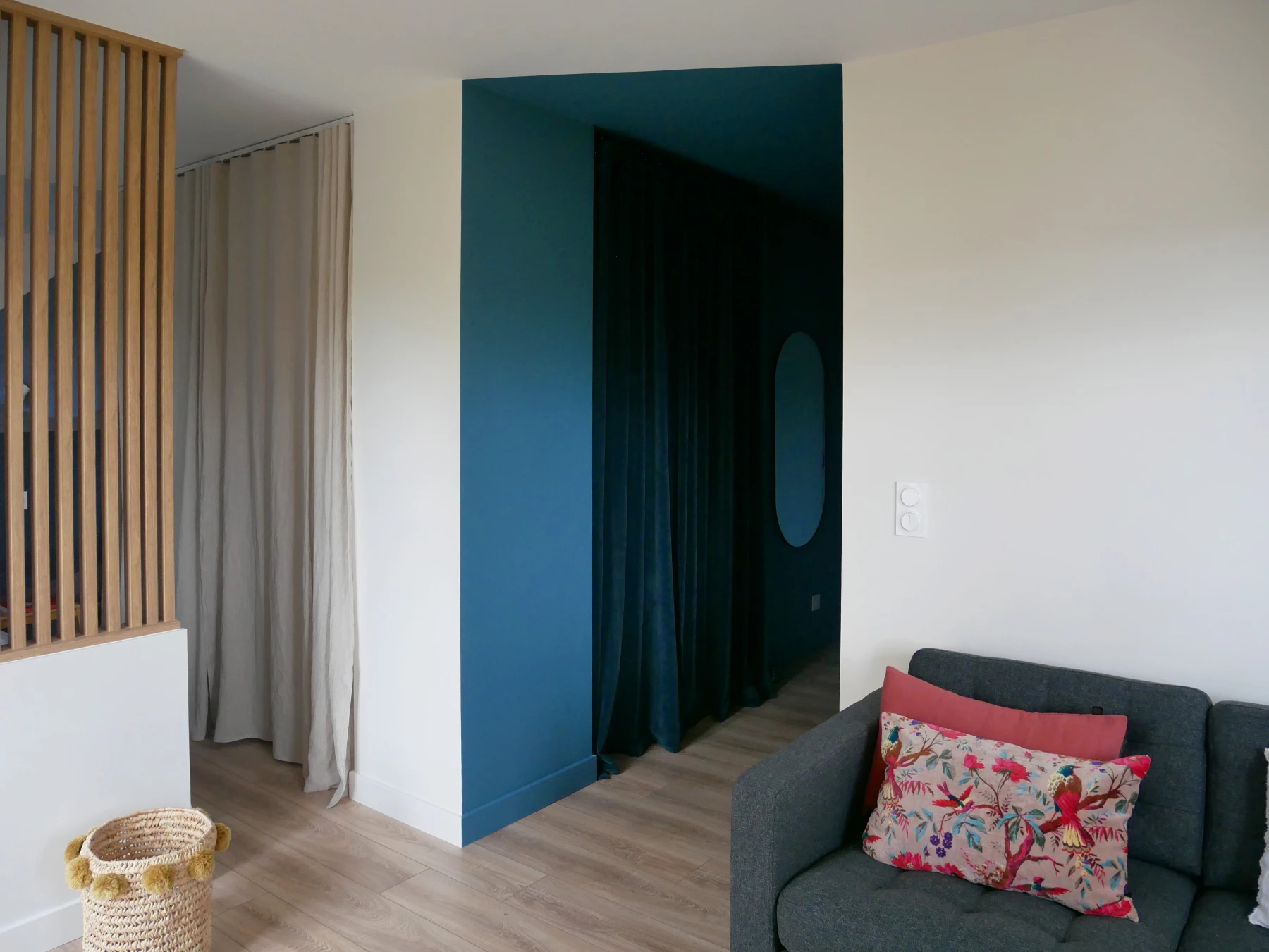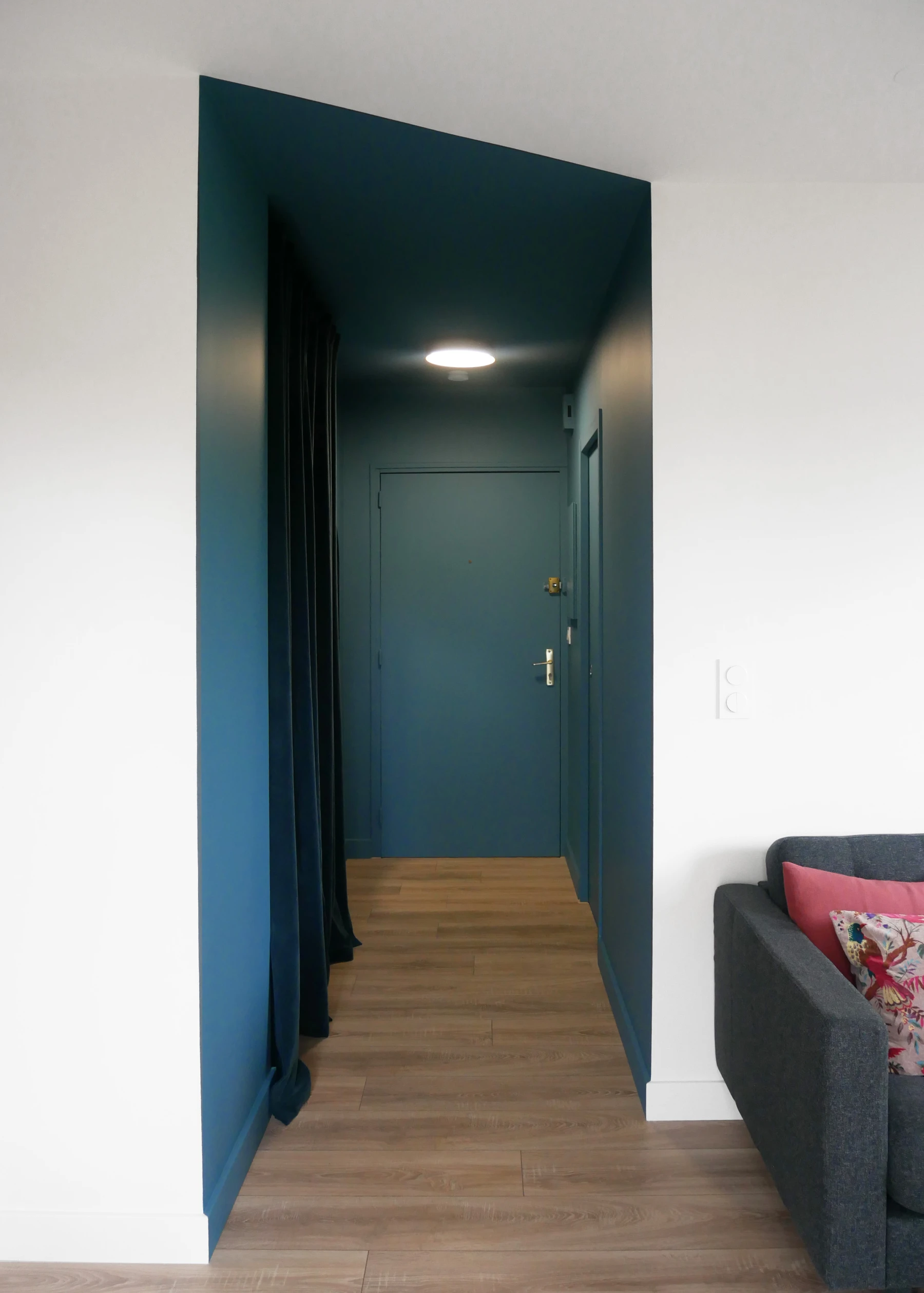 L'entrée est délimitée par la couleur bleue (R910 - La Fantaisie de chez Ressource Peinture). Le rideau en velours de la même teinte ajoute du charme à l'entrée de l'appartement. La pièce de vie est claire et lumineuse.