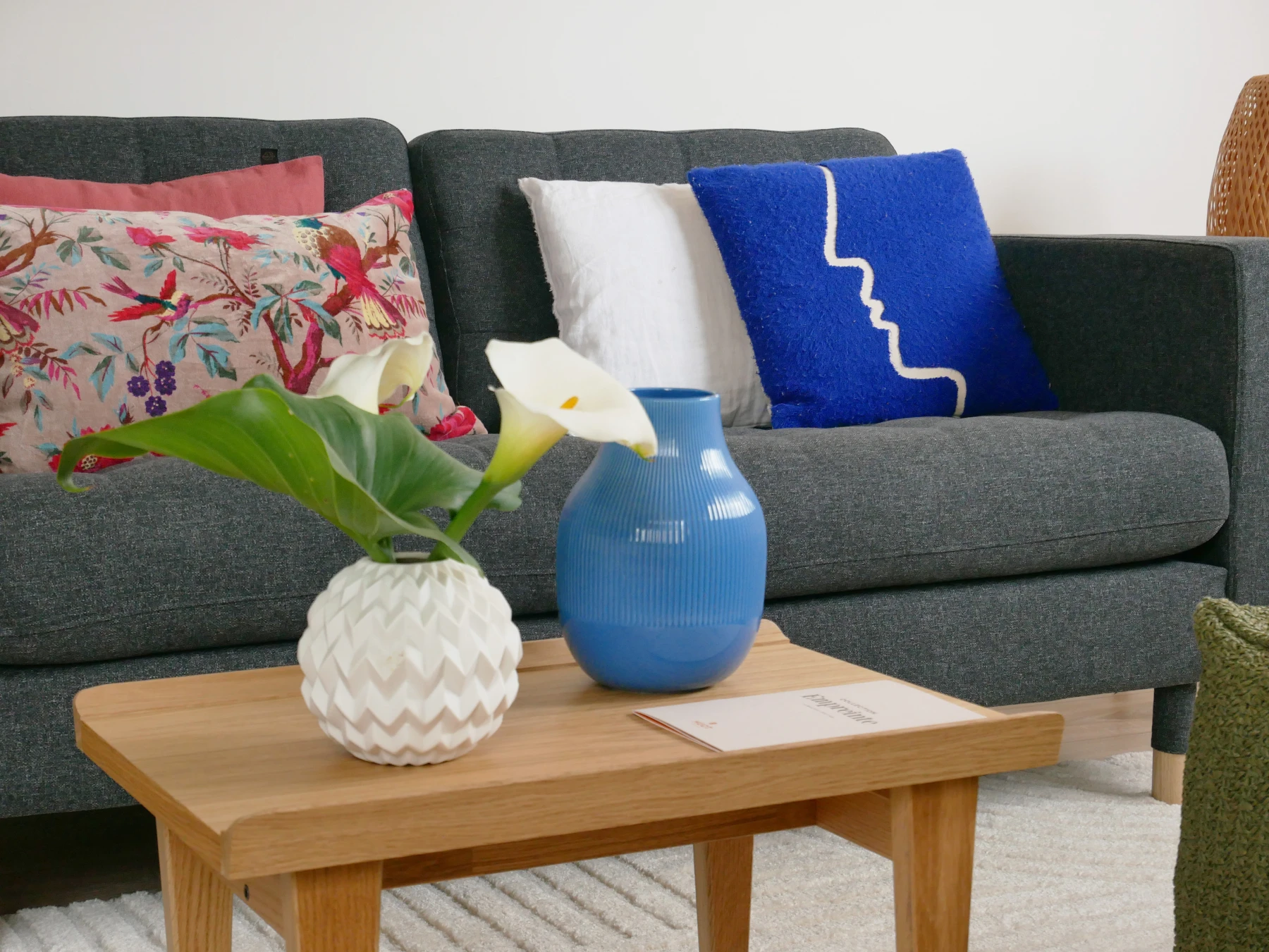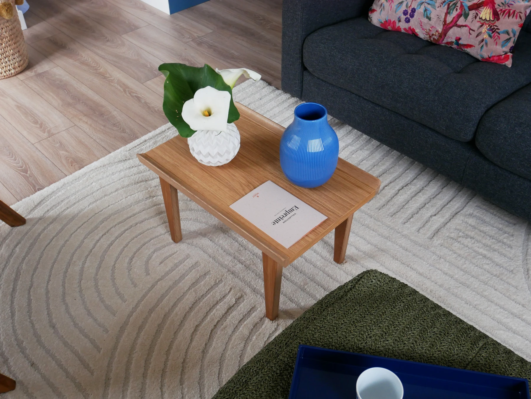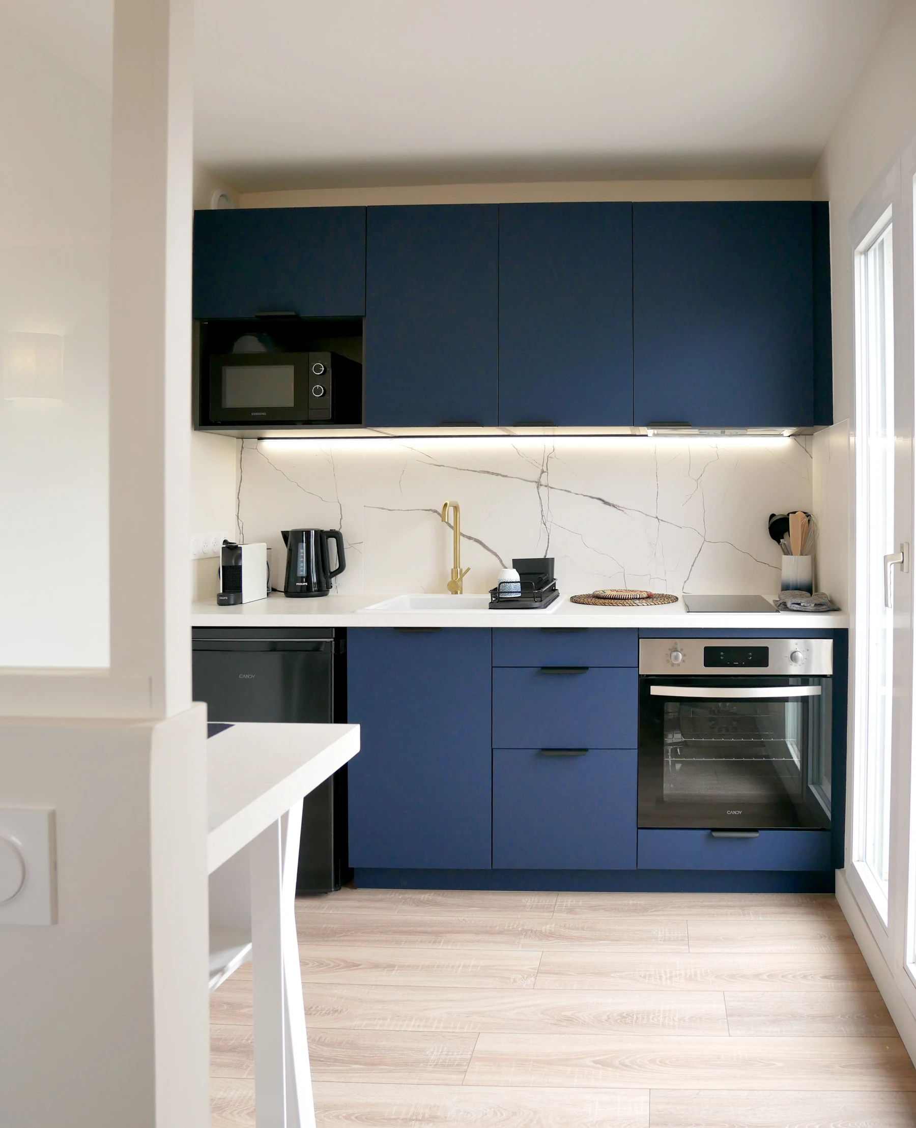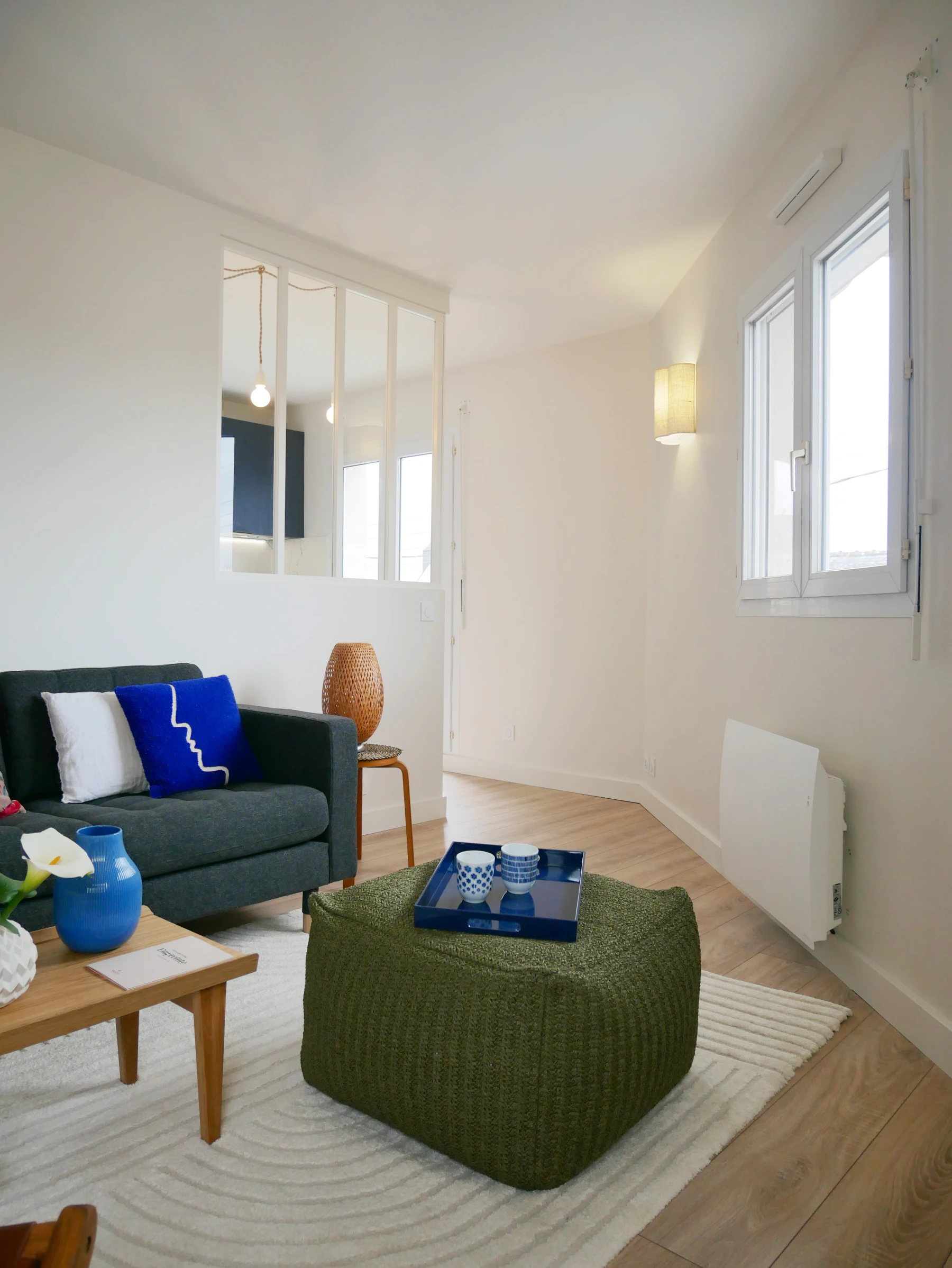 L'entrée est délimitée par la couleur bleue (R910 - La Fantaisie de chez Ressource Peinture). Le rideau en velours de la même teinte ajoute du charme à l'entrée de l'appartement. La pièce de vie est claire et lumineuse.
