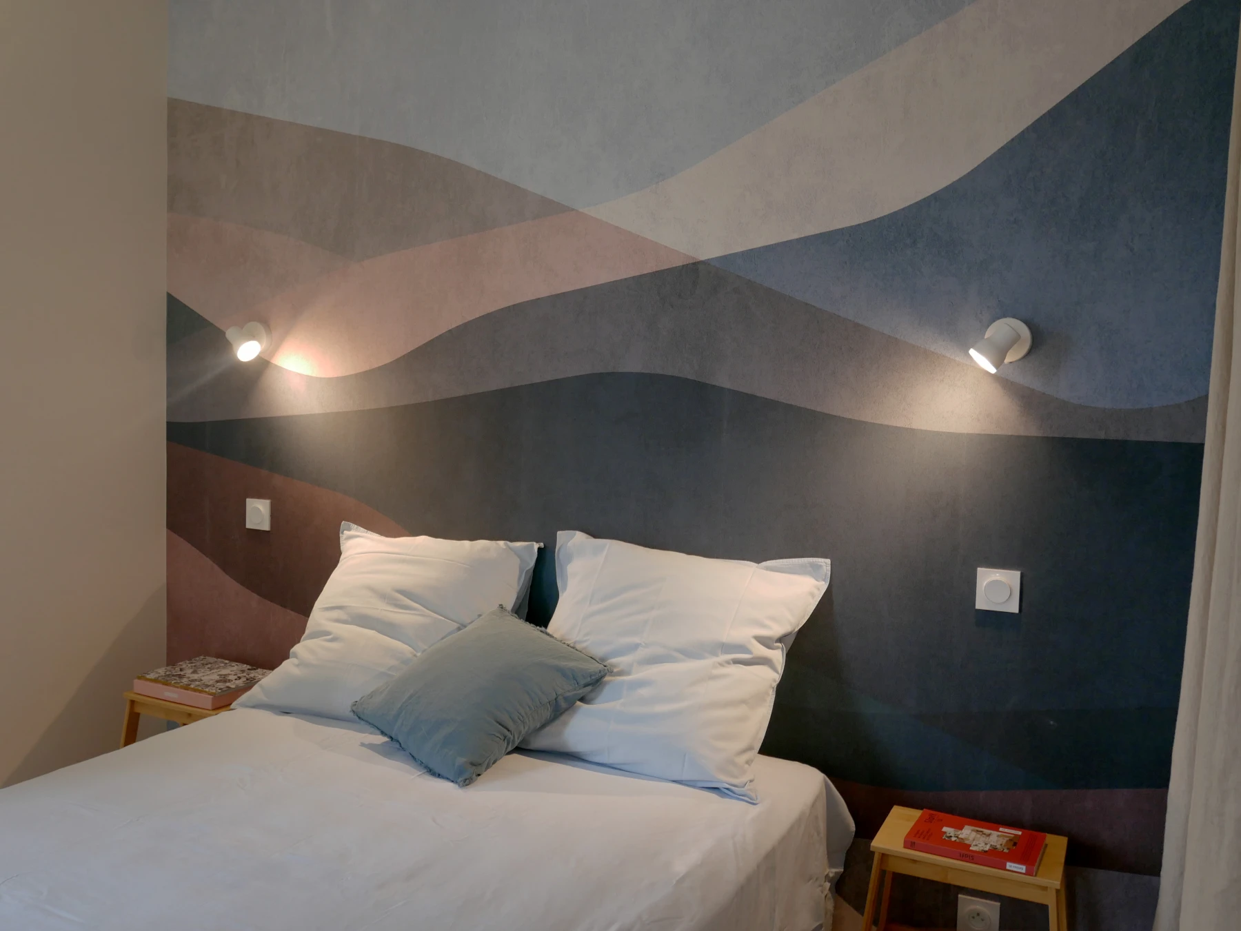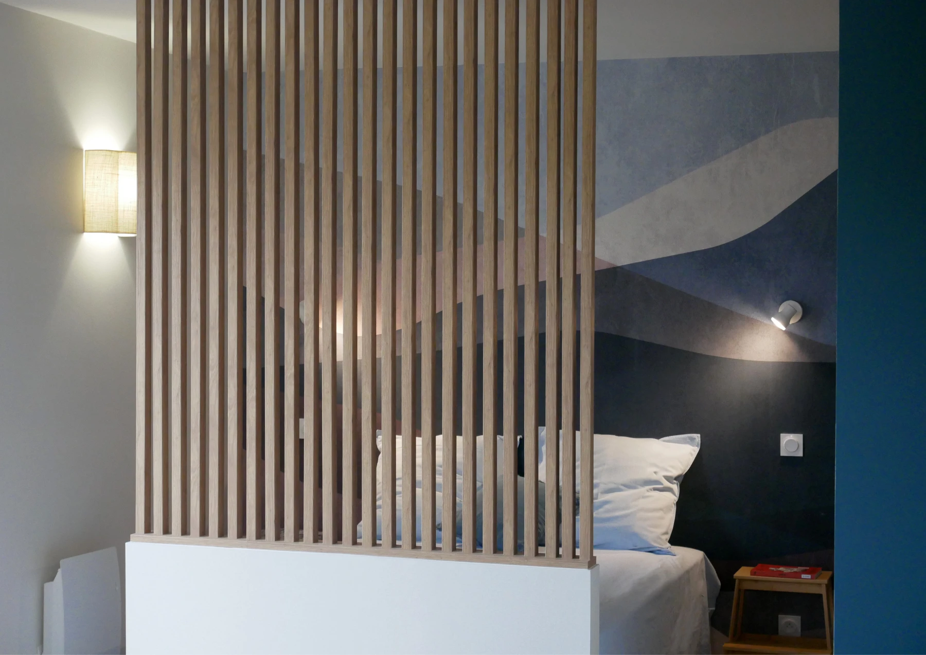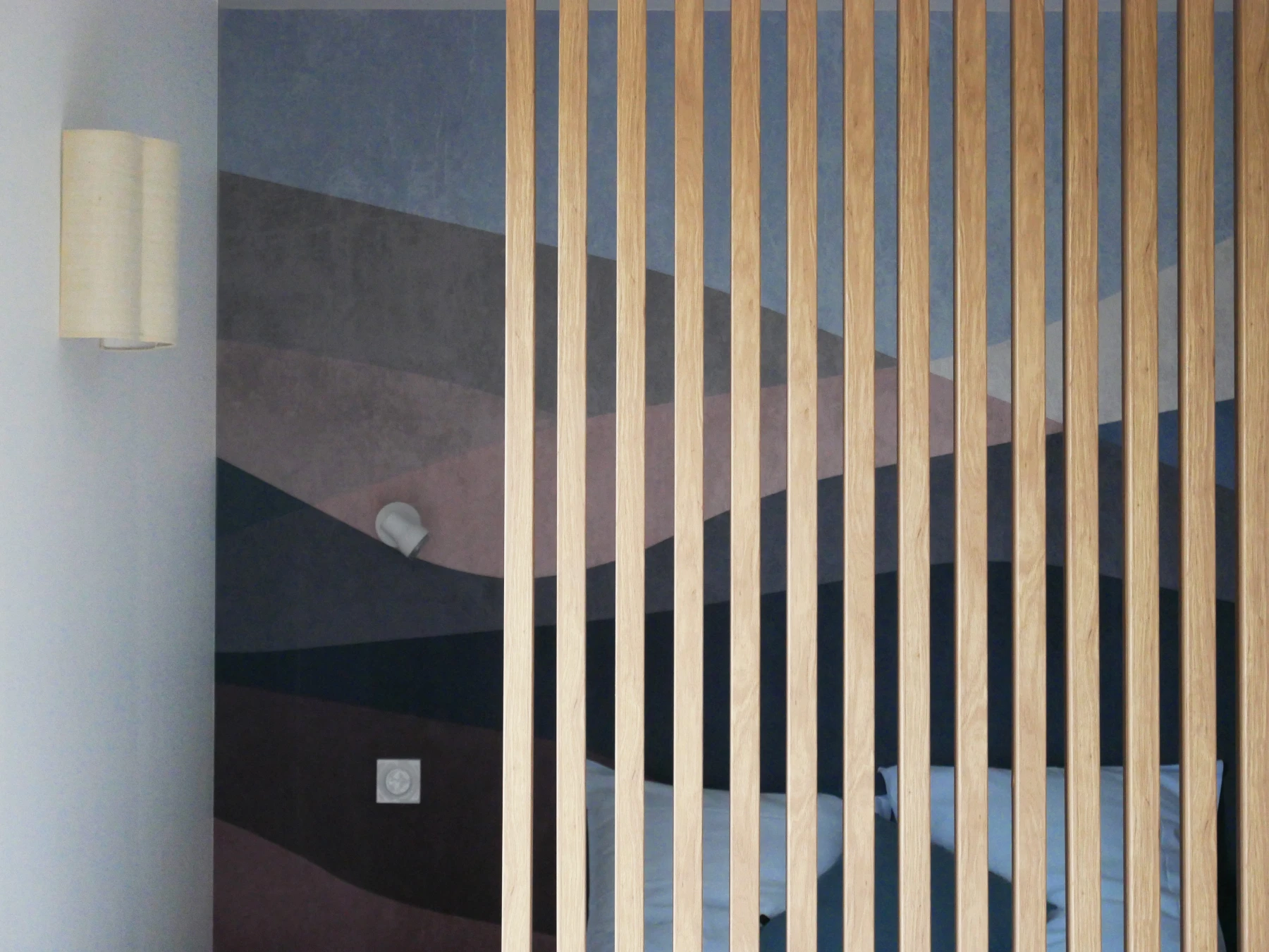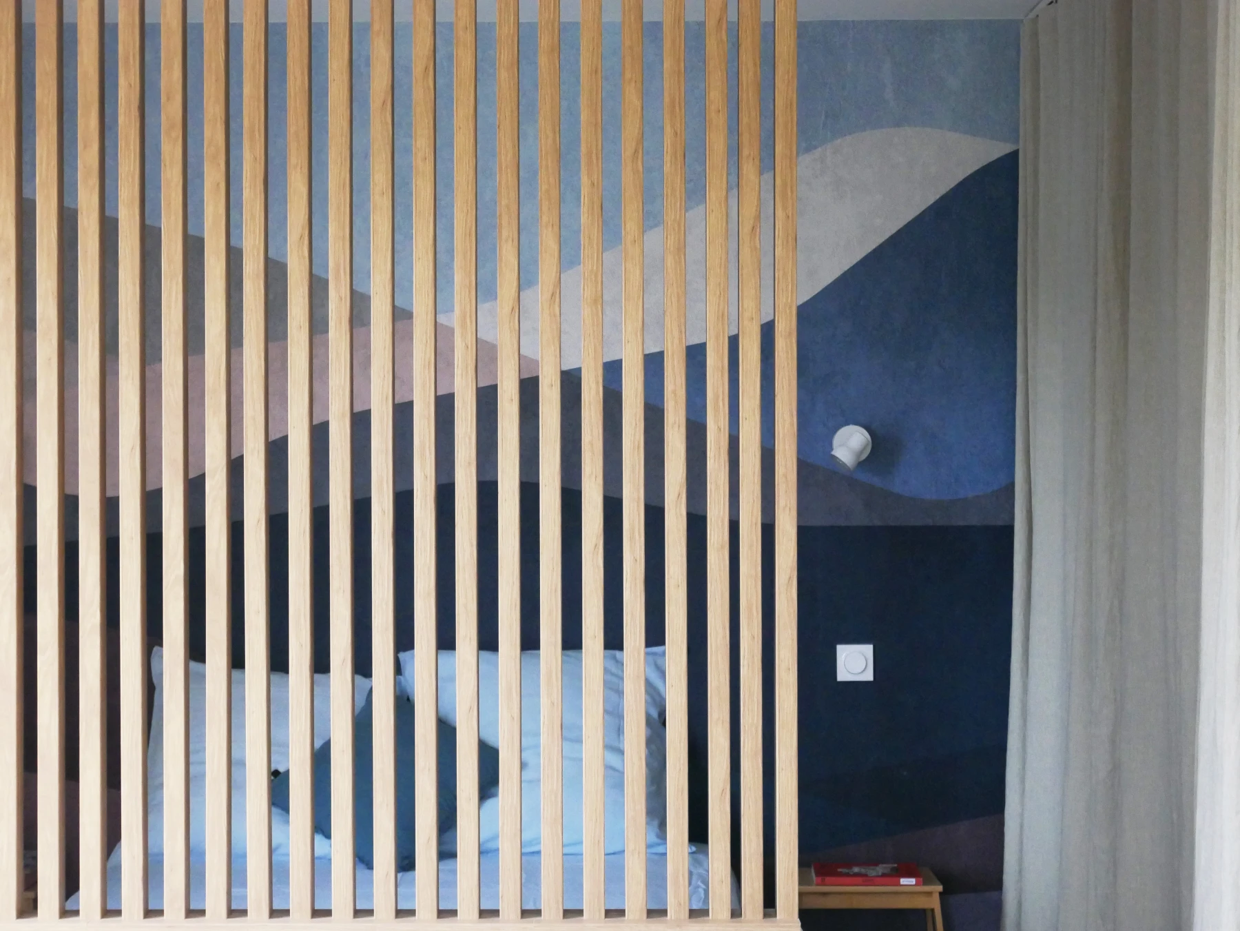 Le papier peint panoramique donne de la profondeur et de l'intimité à l'espace nuit, protégé par un claustra bois.