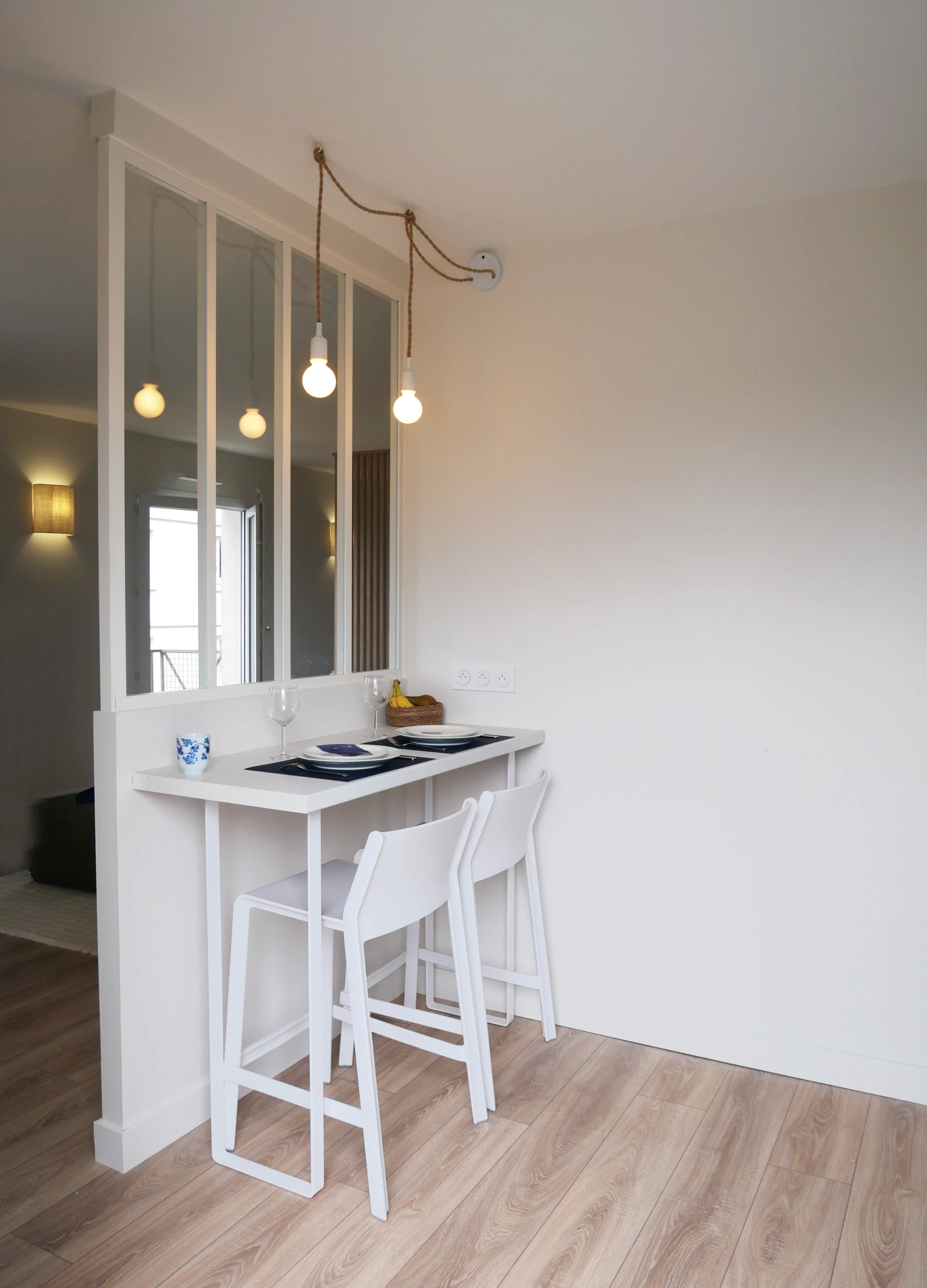 La cuisine, quant à elle, s'organise derrière une verrière blanche, avec un coin repas en hauteur bar. La lumière circule ainsi dans l'appartement.