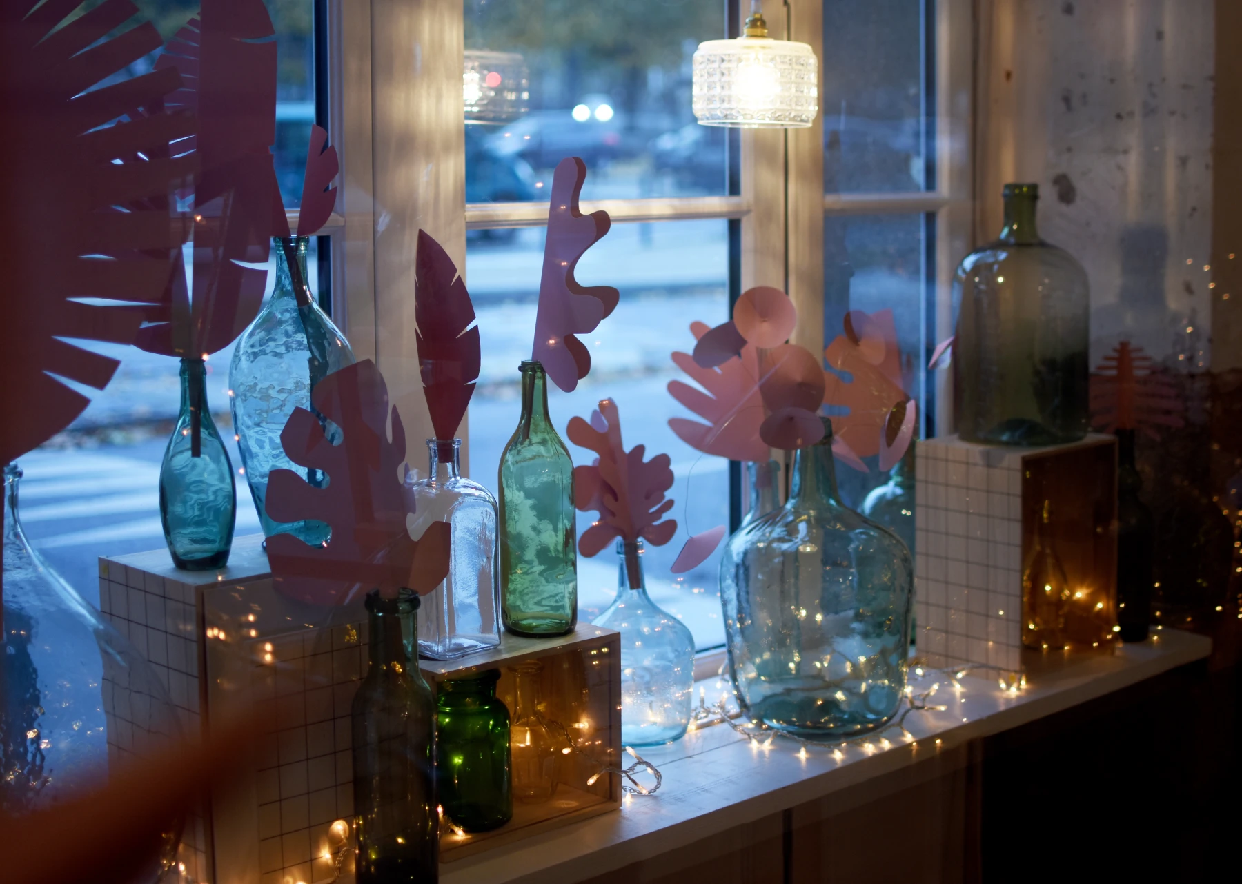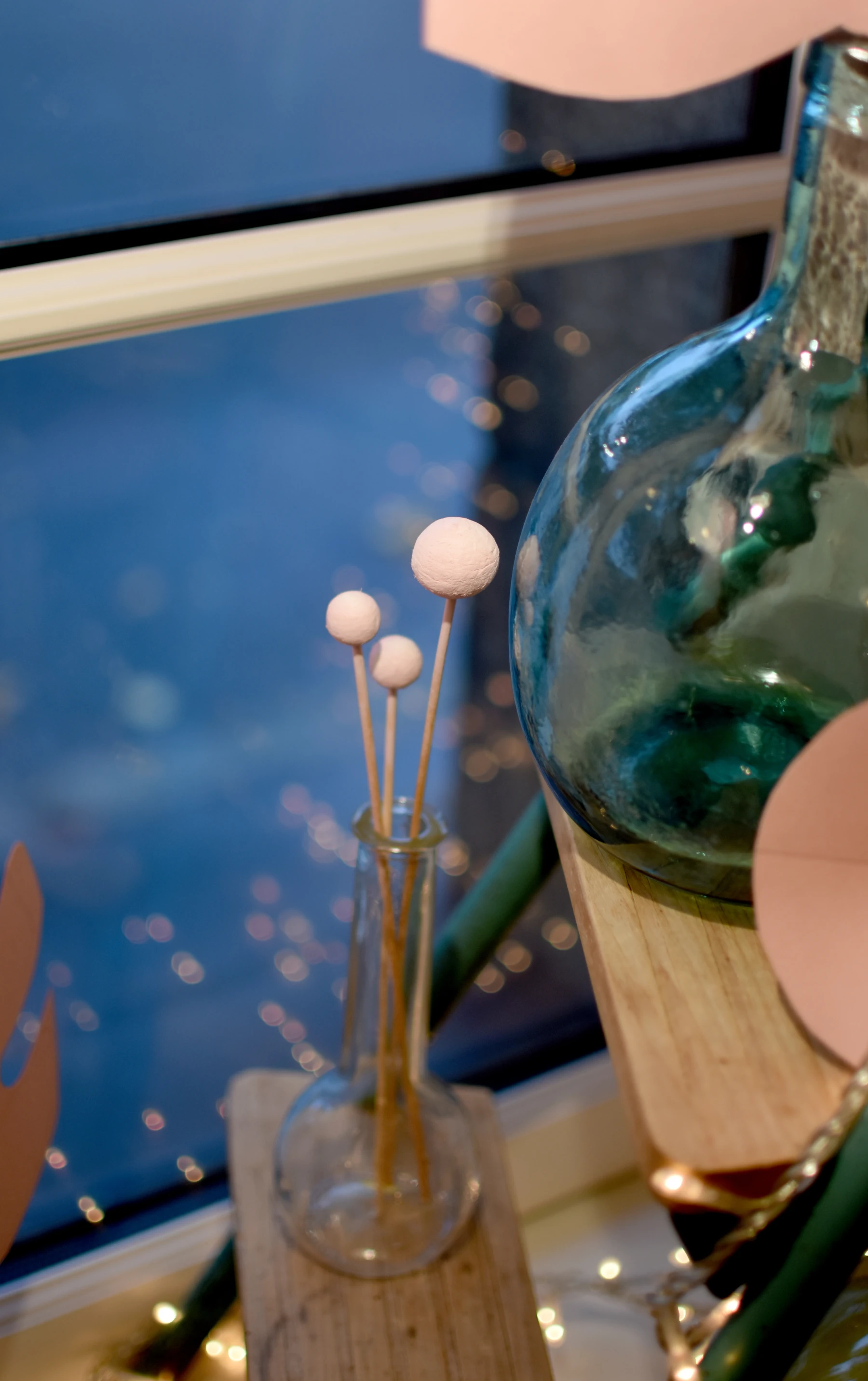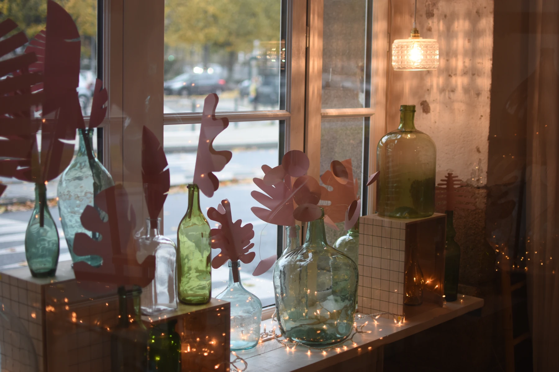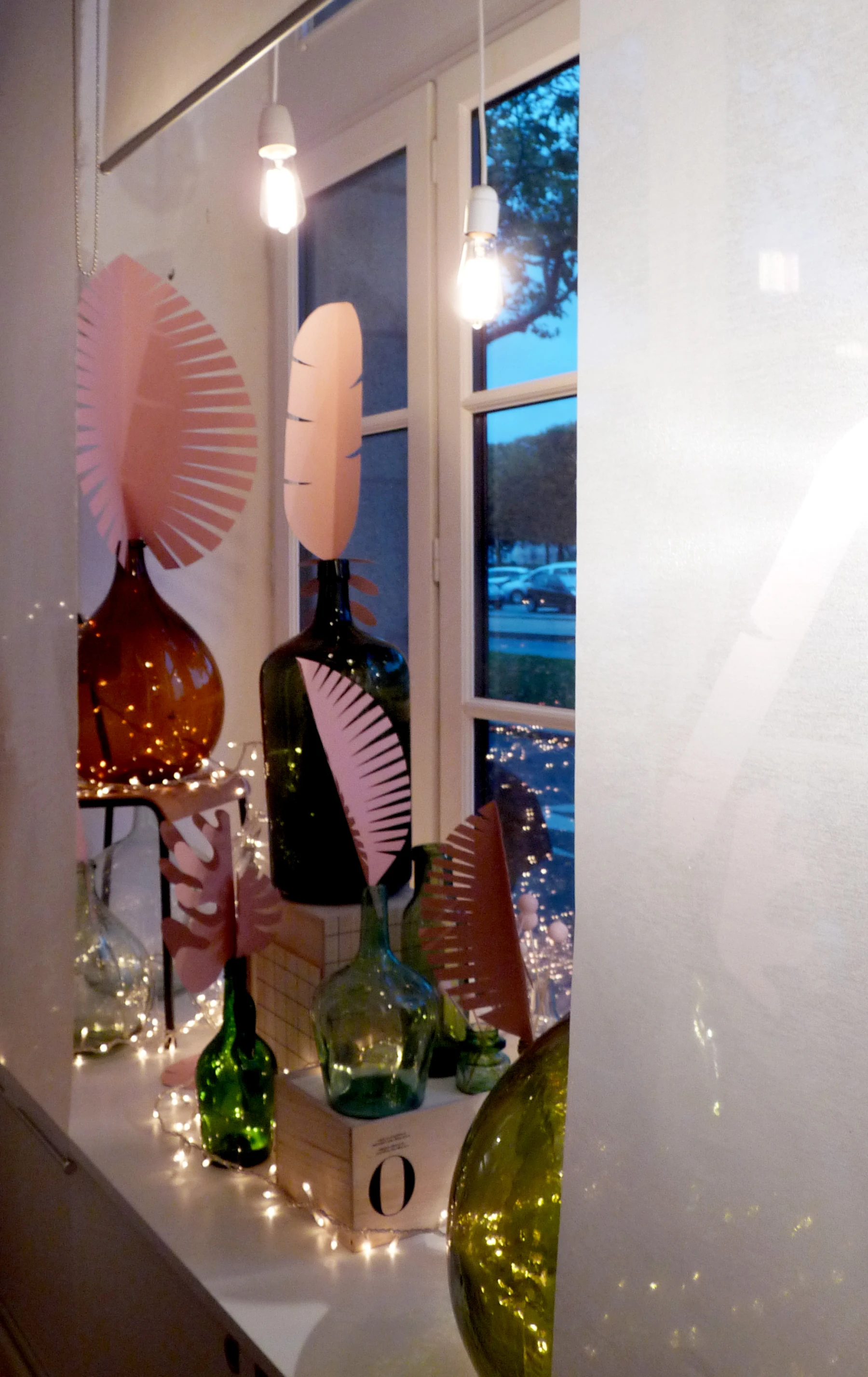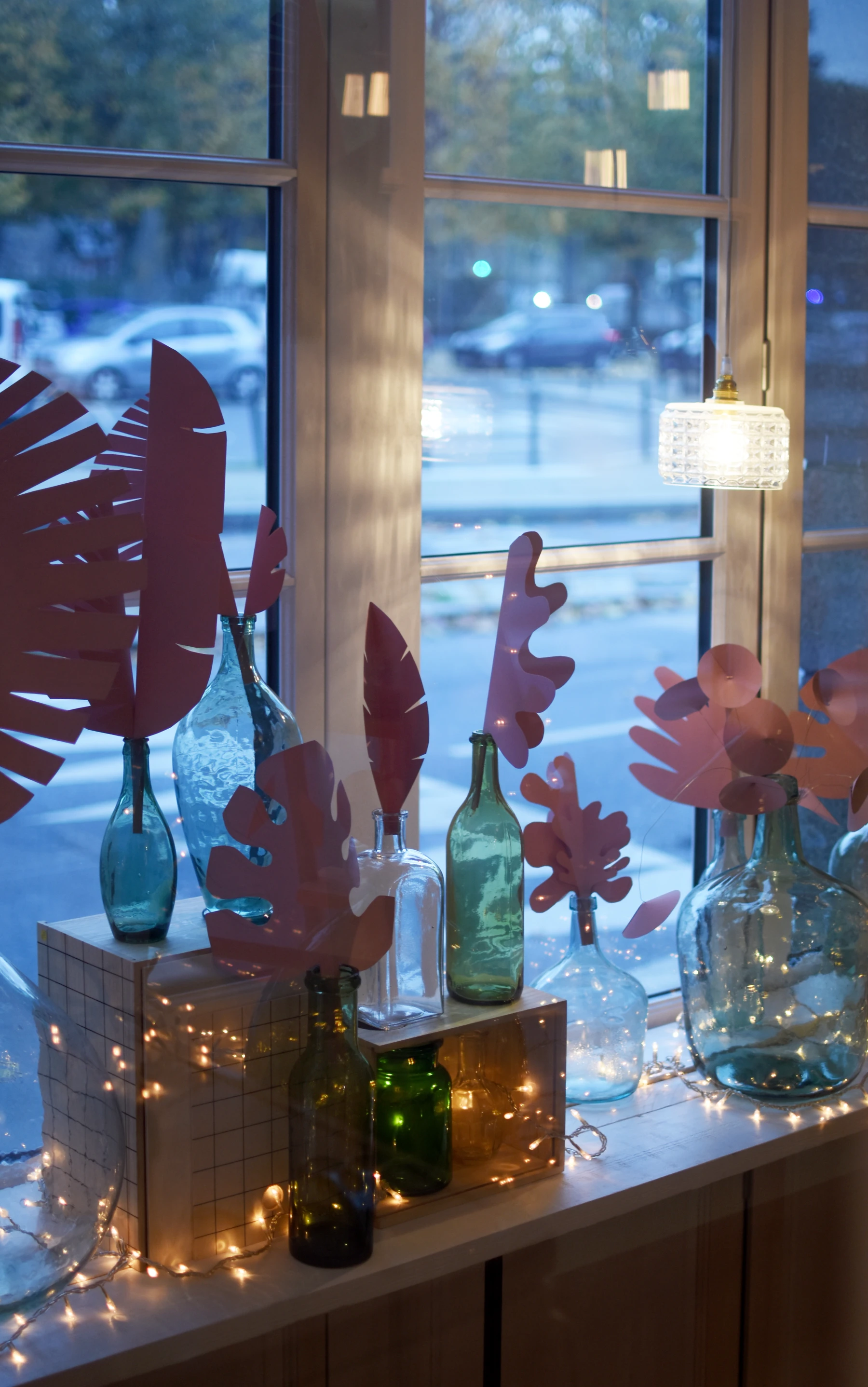 Des feuilles en papier découpé viennent créer un paysage. Cette végétation uniforme proflonge l’harmonie des couleurs et donne de la douceur à cet univers. Cette vitrine est faite pour être vue aussi bien depuis la rue que depuis l’intérieur de la boutique.