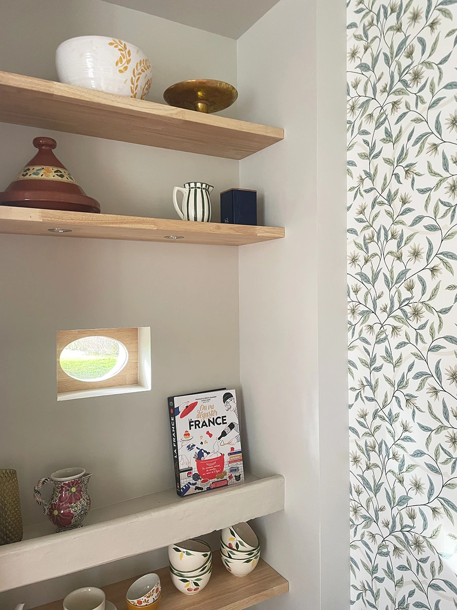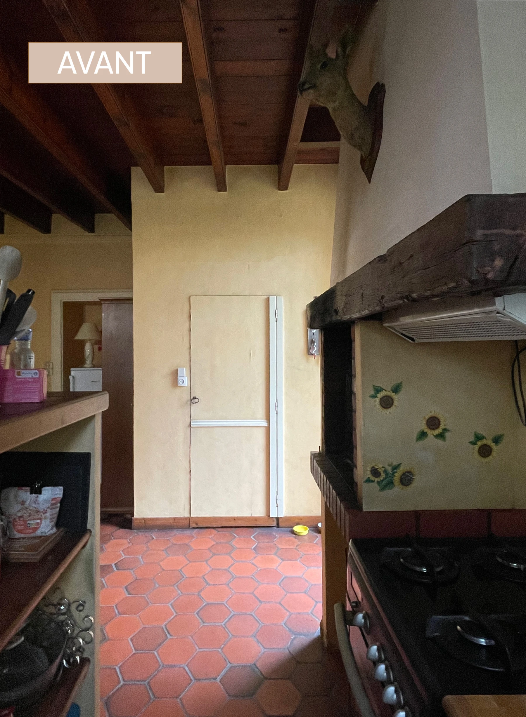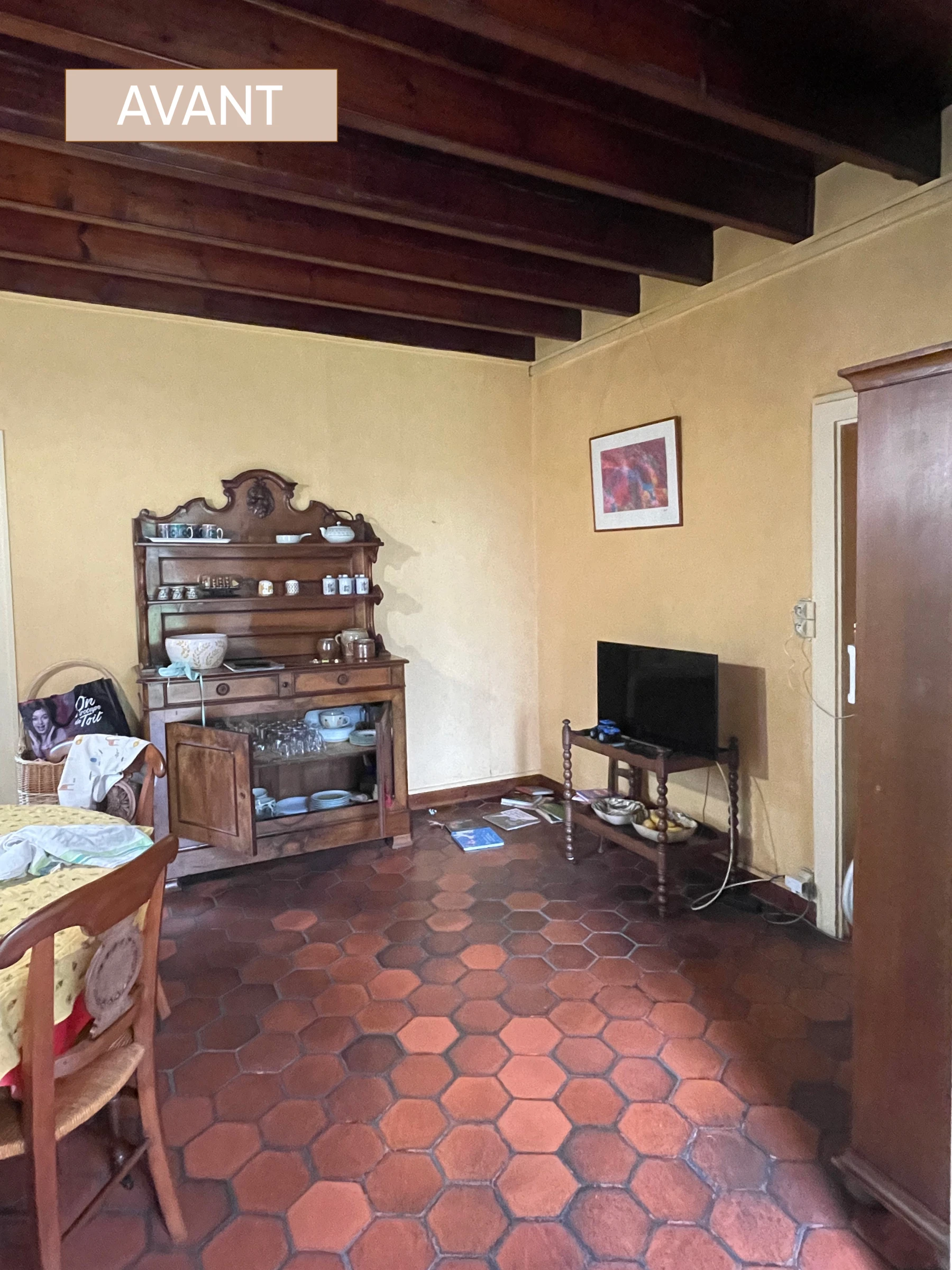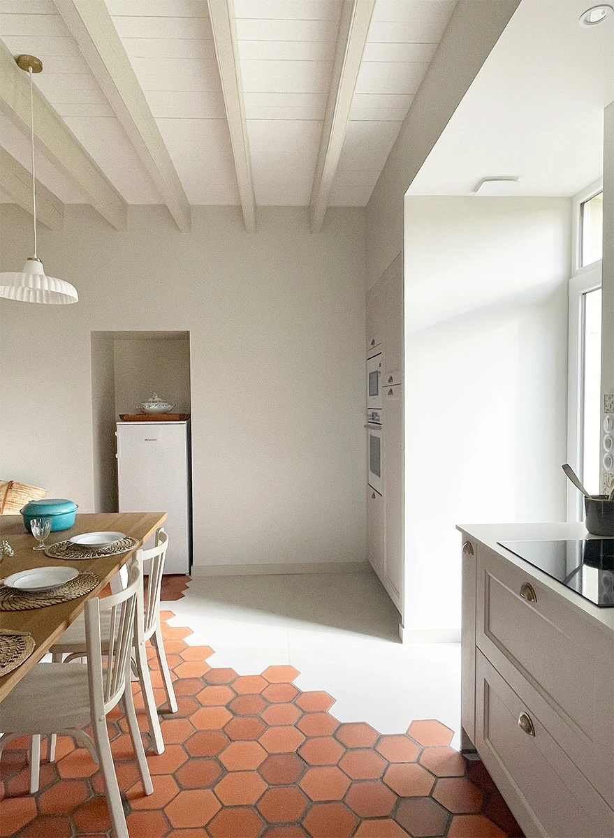 Le placard de rangement a été démoli ainsi que le bar, l'ancienne cuisine, et les portes du placard qui cachaient l'oeil de boeuf. Le sol en tomette a été rénové, complété par un carrelage imitant le béton ciré.