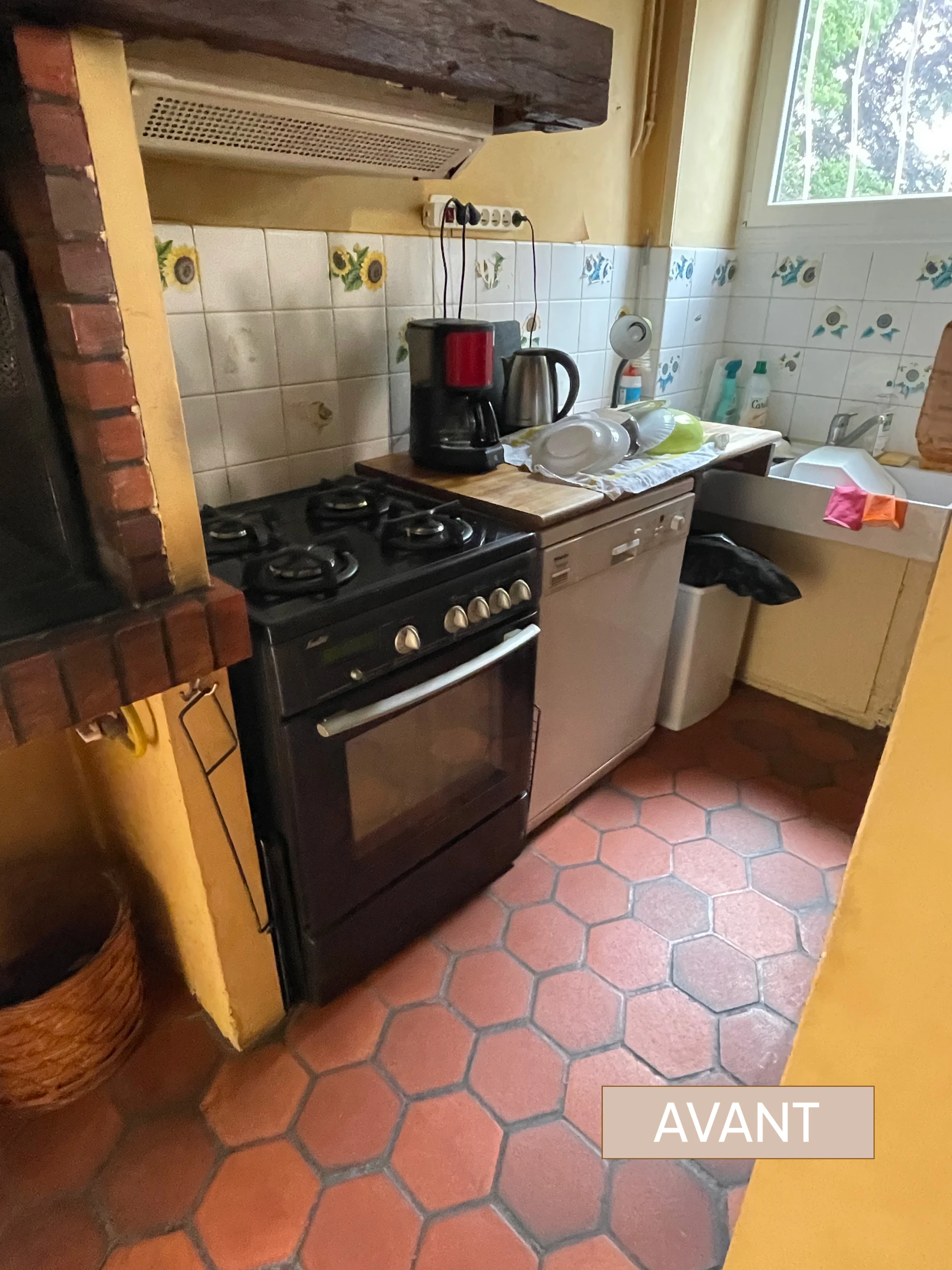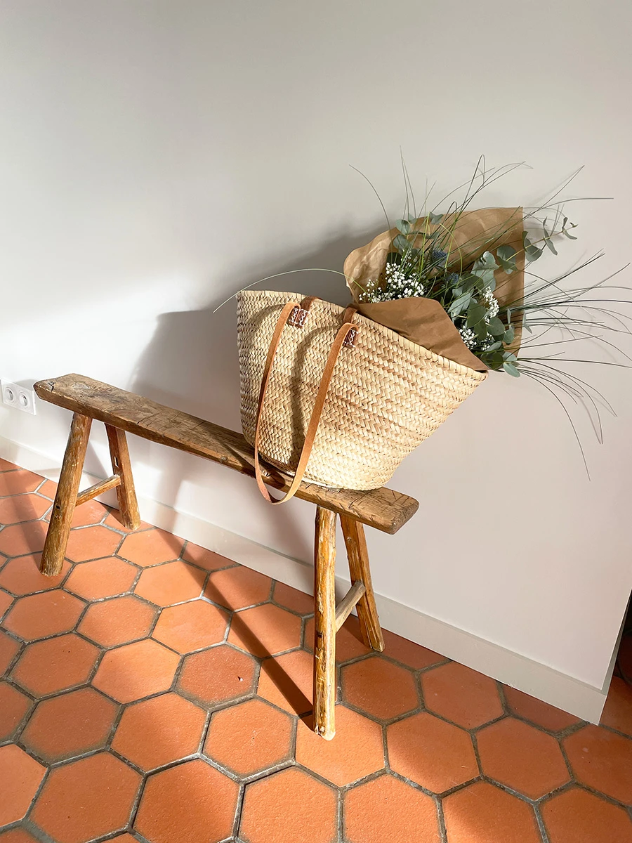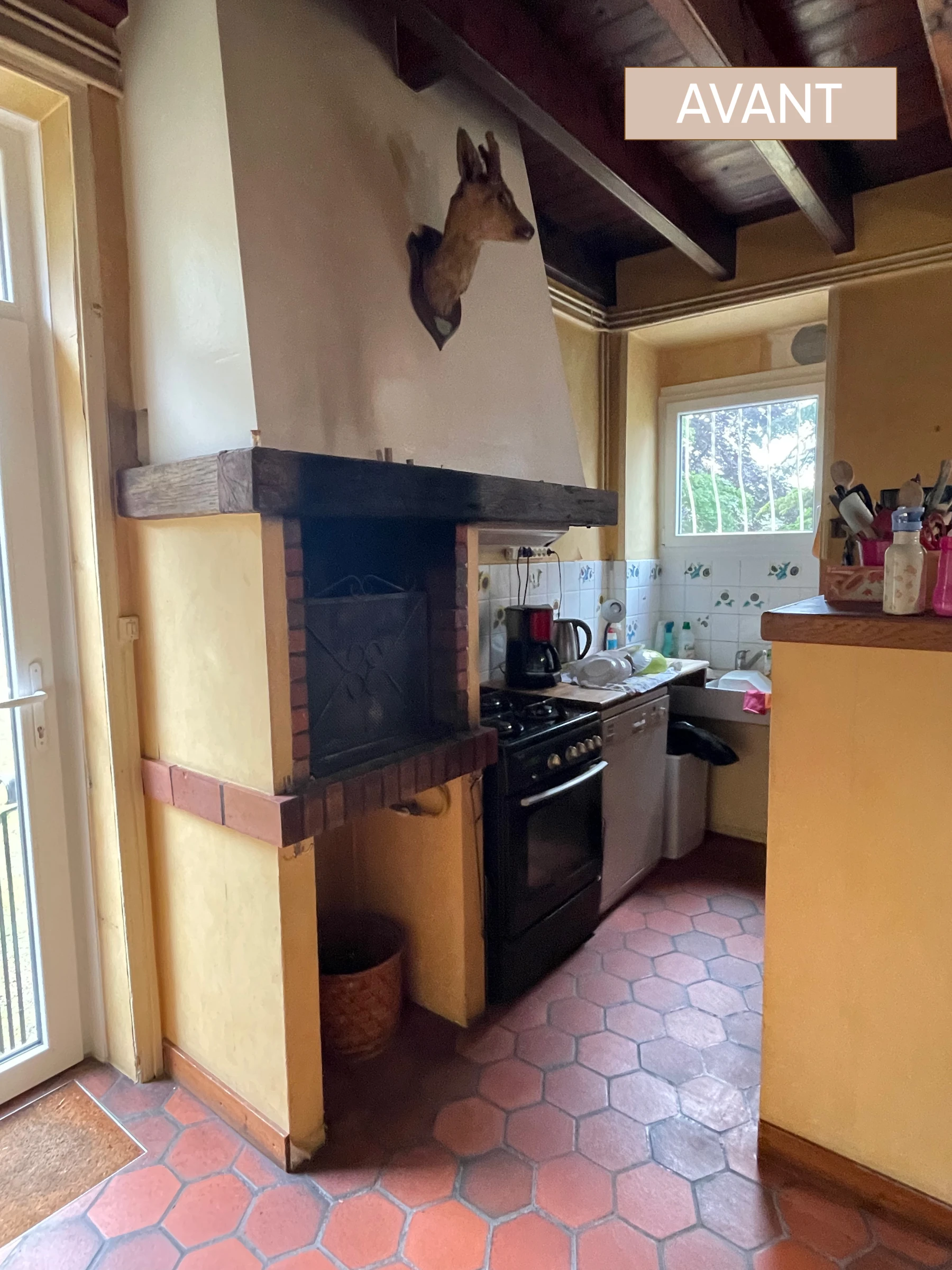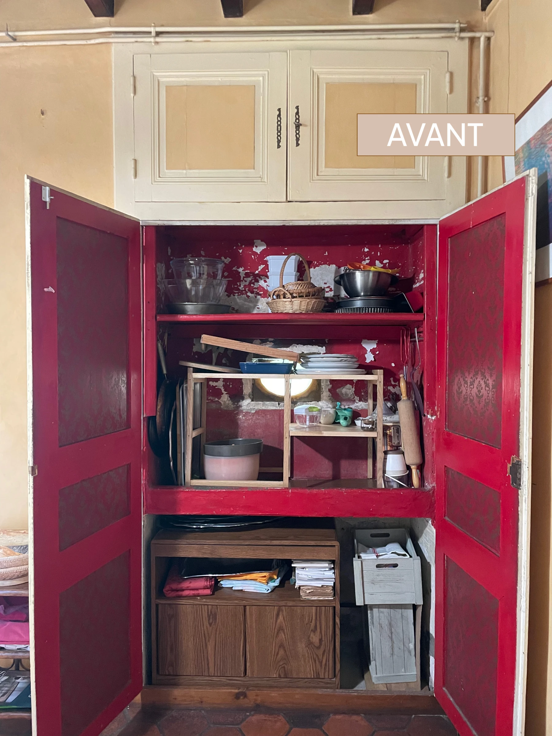 Le placard de rangement a été démoli ainsi que le bar, l'ancienne cuisine, et les portes du placard qui cachaient l'oeil de boeuf. Le sol en tomette a été rénové, complété par un carrelage imitant le béton ciré.