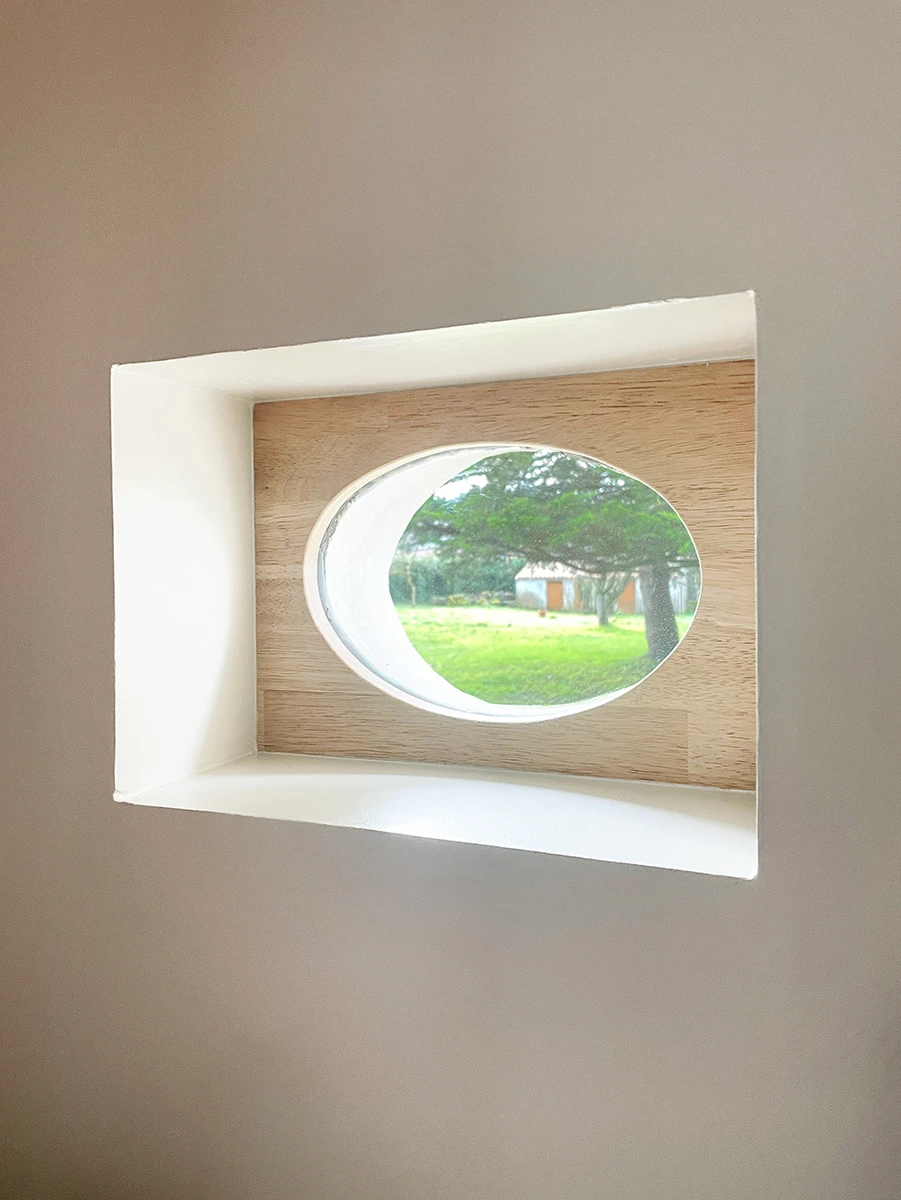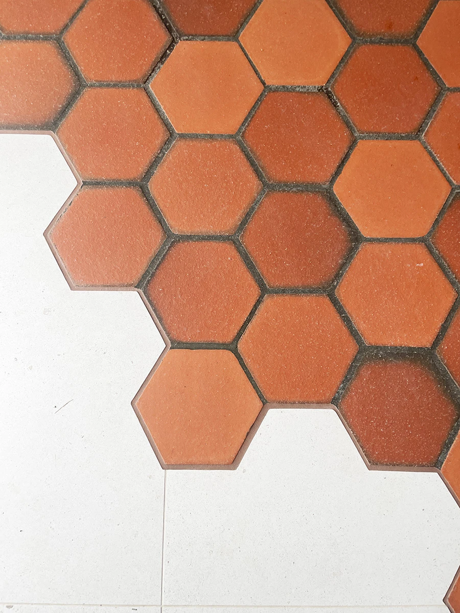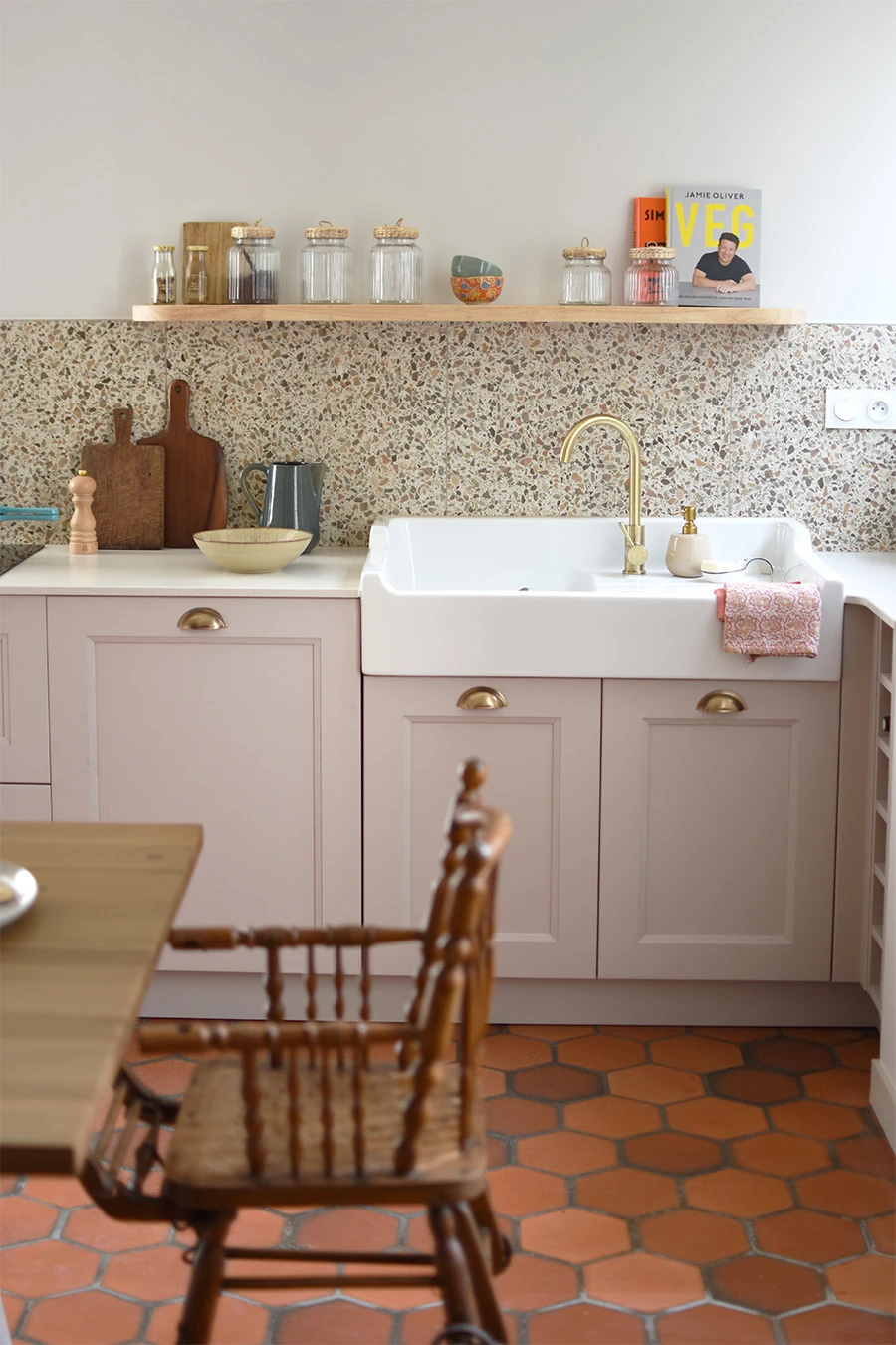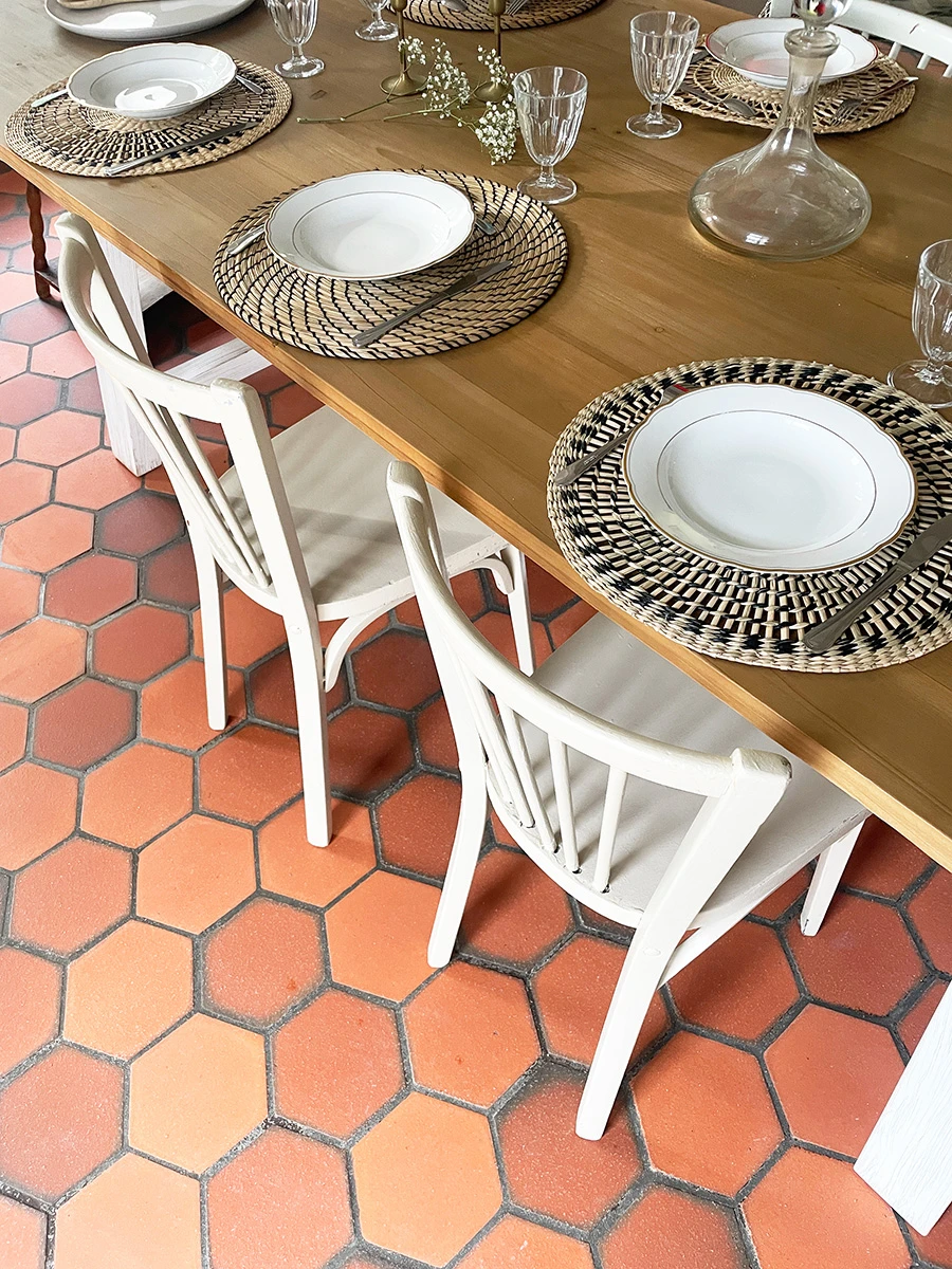 Le placard de rangement a été démoli ainsi que le bar, l'ancienne cuisine, et les portes du placard qui cachaient l'oeil de boeuf. Le sol en tomette a été rénové, complété par un carrelage imitant le béton ciré.