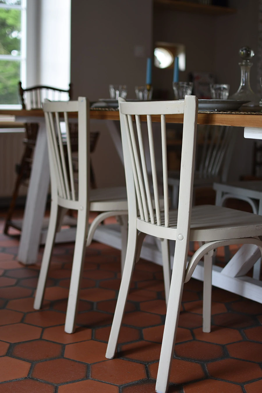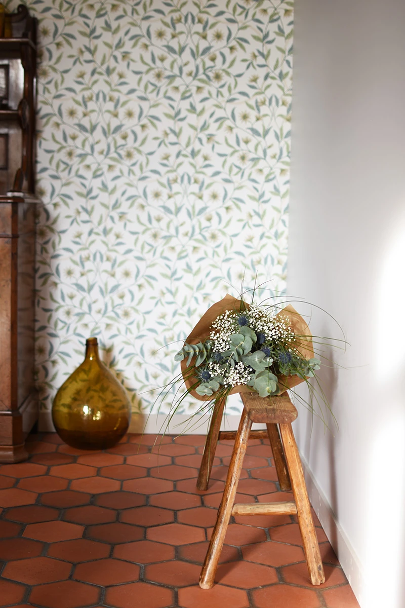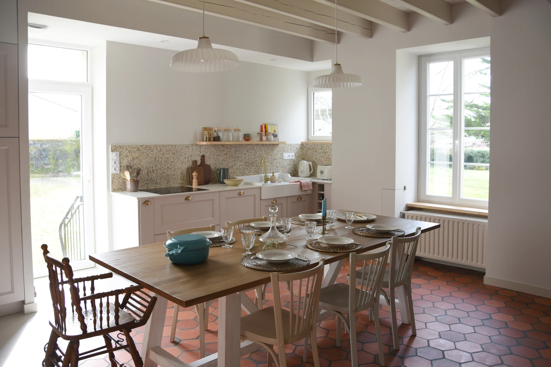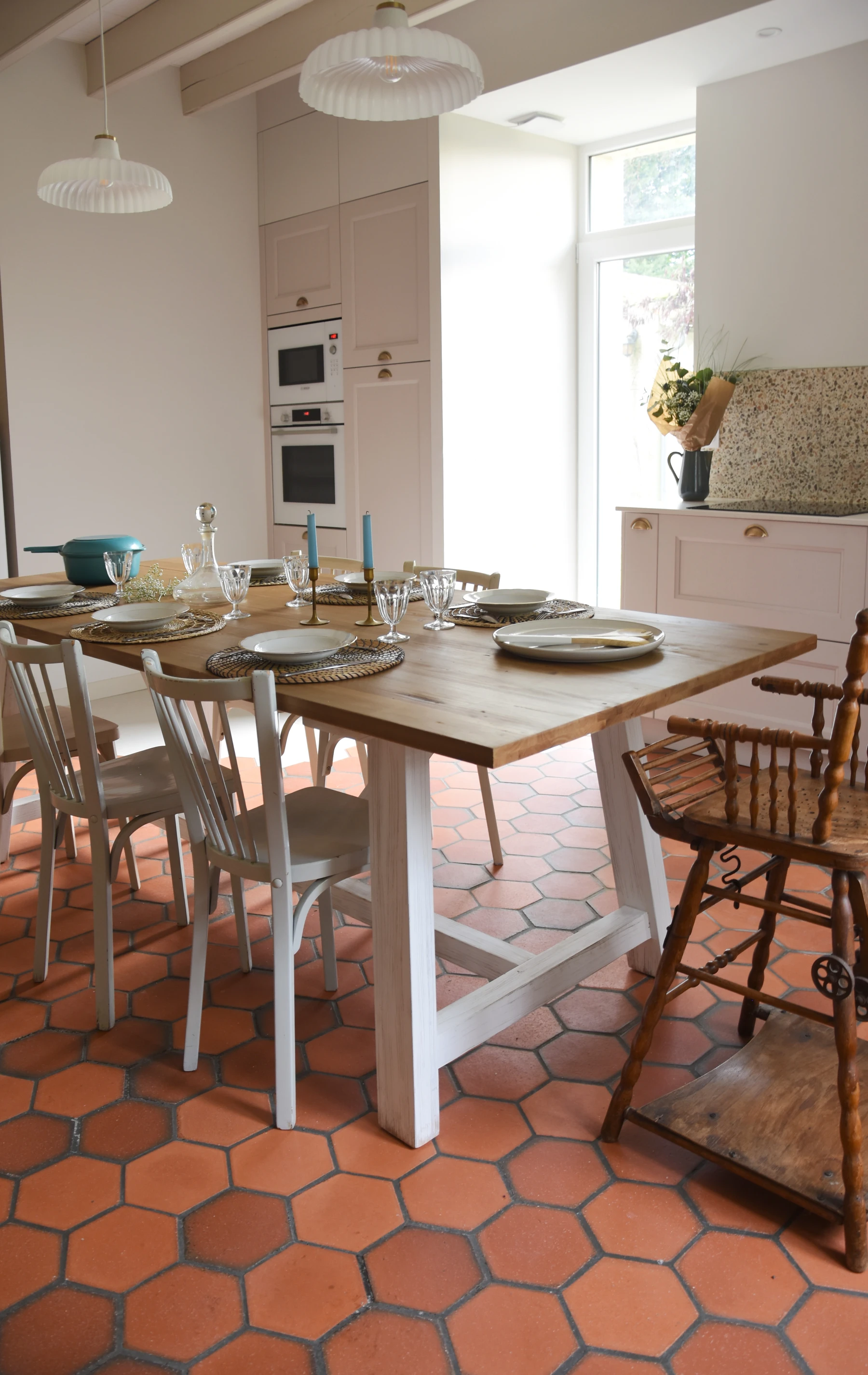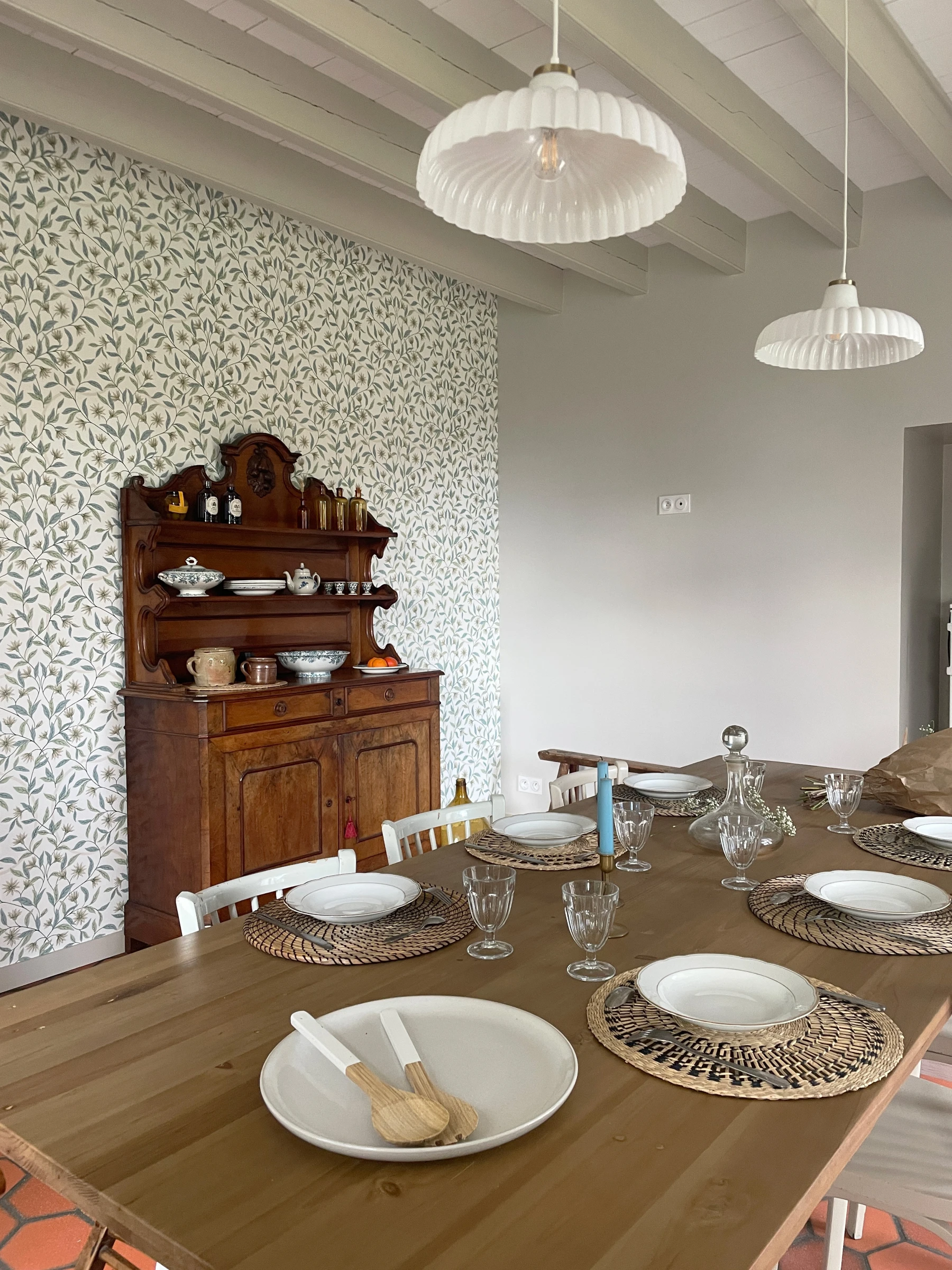 Le plafond et les poutres ont été repeints; un joli papier peint ajoute du charme à l'espace et souligne la beauté du vaisselier en bois. Une grande table de ferme vient animer le centre de la pièce.