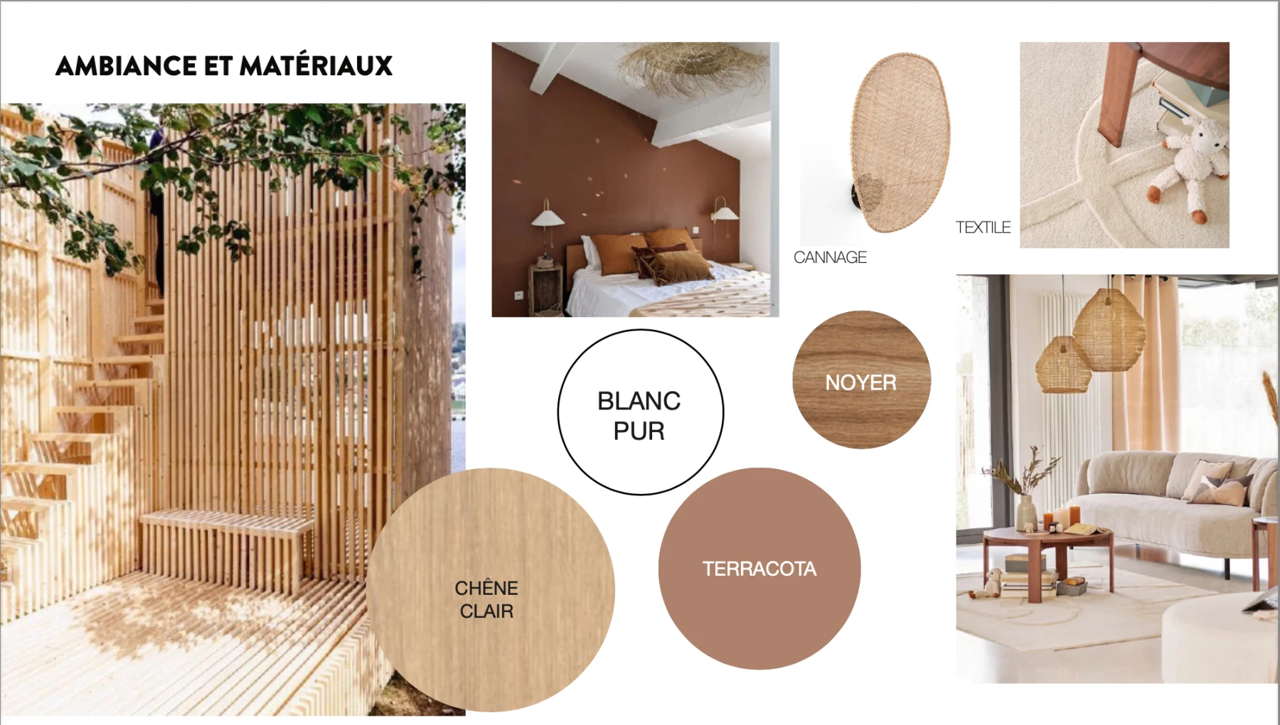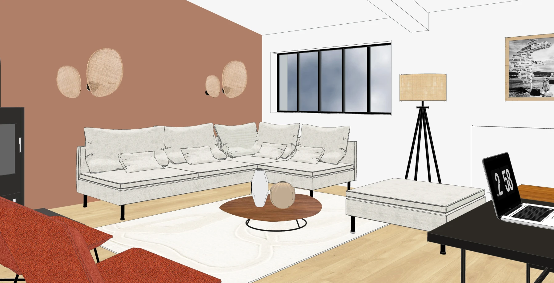 Le projet d'aménagement et de décoration est axé sur des teintes chaudes et végétales (couleur terracotta, fibre naturelle pour les luminaires, table basses en noyer...) pour contraster avec les nuances de couleur bleu-vert de la maison principale. Ainsi, cet atelier peut aussi être considéré comme un salon d'hiver et ne fait pas doublon avec la maison principale.