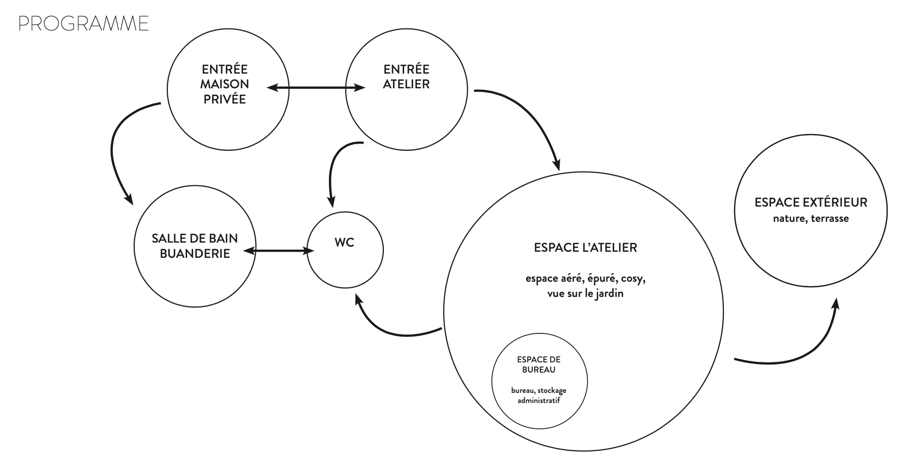 Pour répondre à cette demande, j’ai analysé le schéma des circulations entre l’extérieur, la maison et cet atelier de façon à pouvoir si besoin circuler par l’intérieur et si besoin séparer les deux espaces.