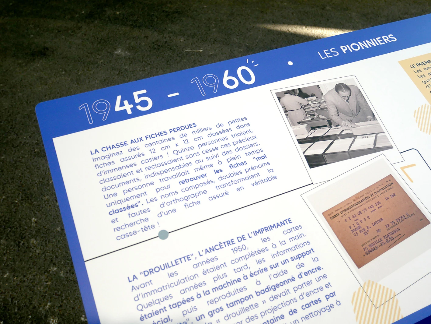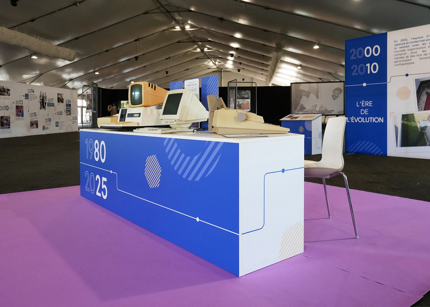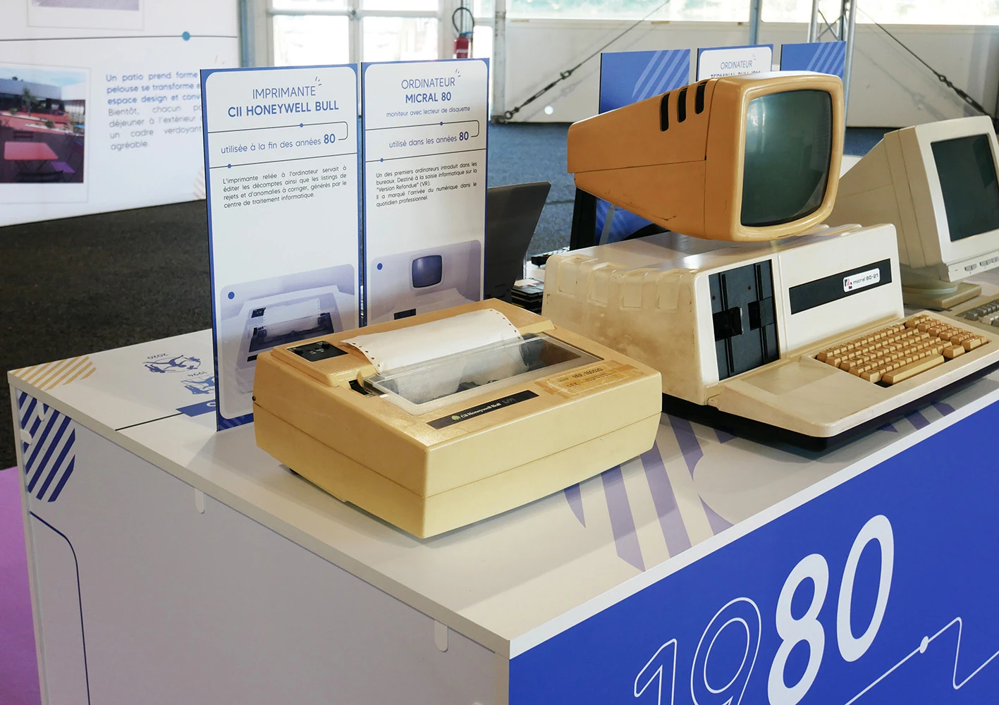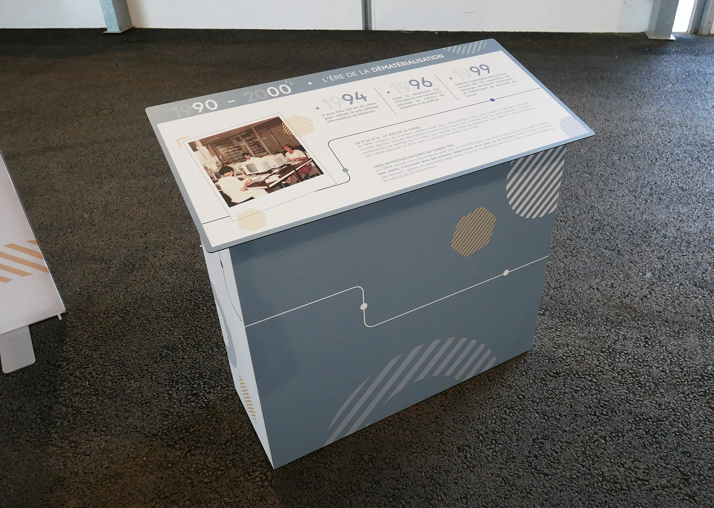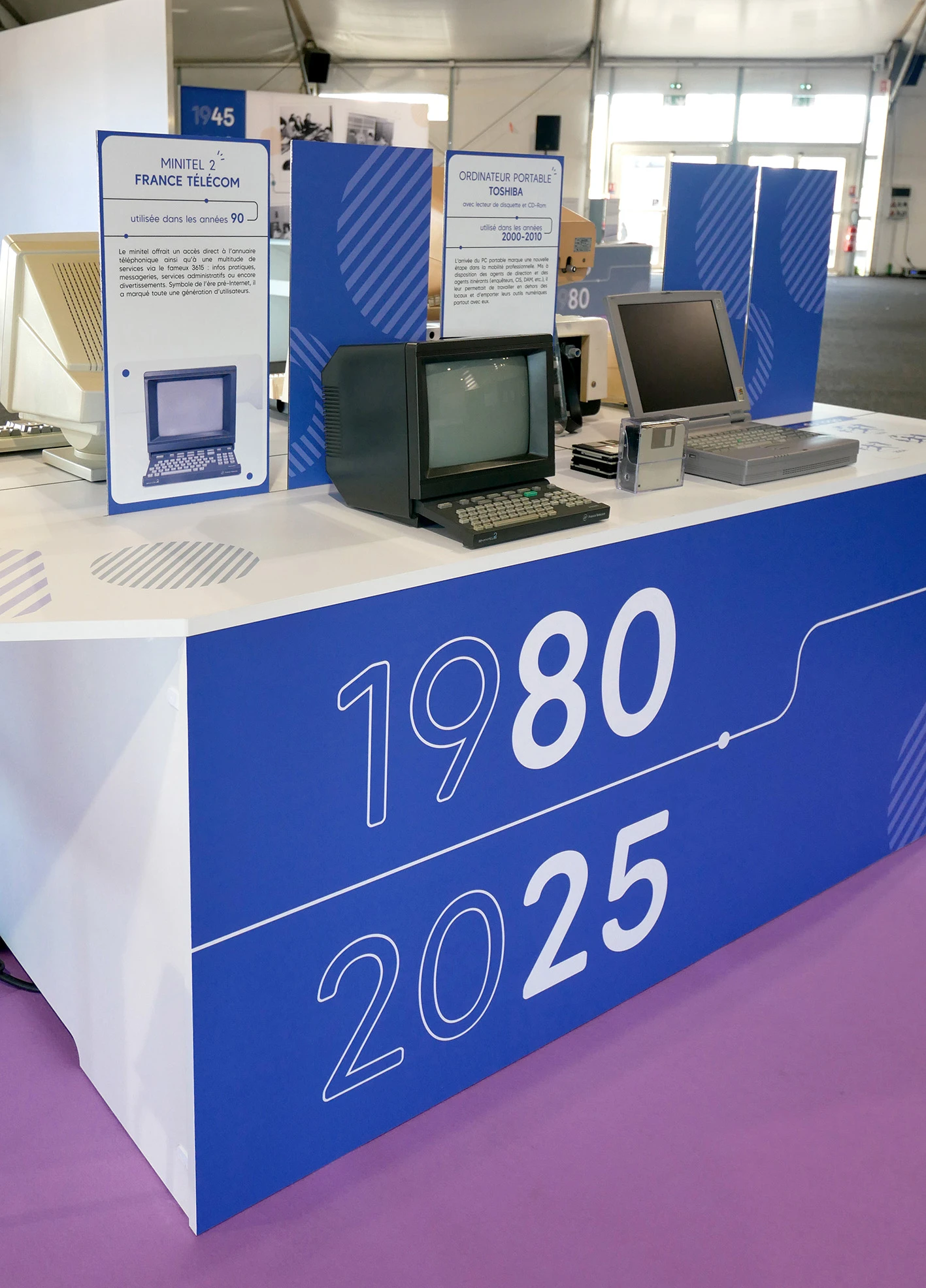 Cette exposition illustre la profonde transformation de la façon de travailler : l'arrivée de l'informatique, la révolution du numérique, et aujourd'hui, l'ère du digital. Cette évolution est expliquée par des photos d'époques grand format, des objets, des extraits vidéos, les campagnes de communication, l'évolution du logo....